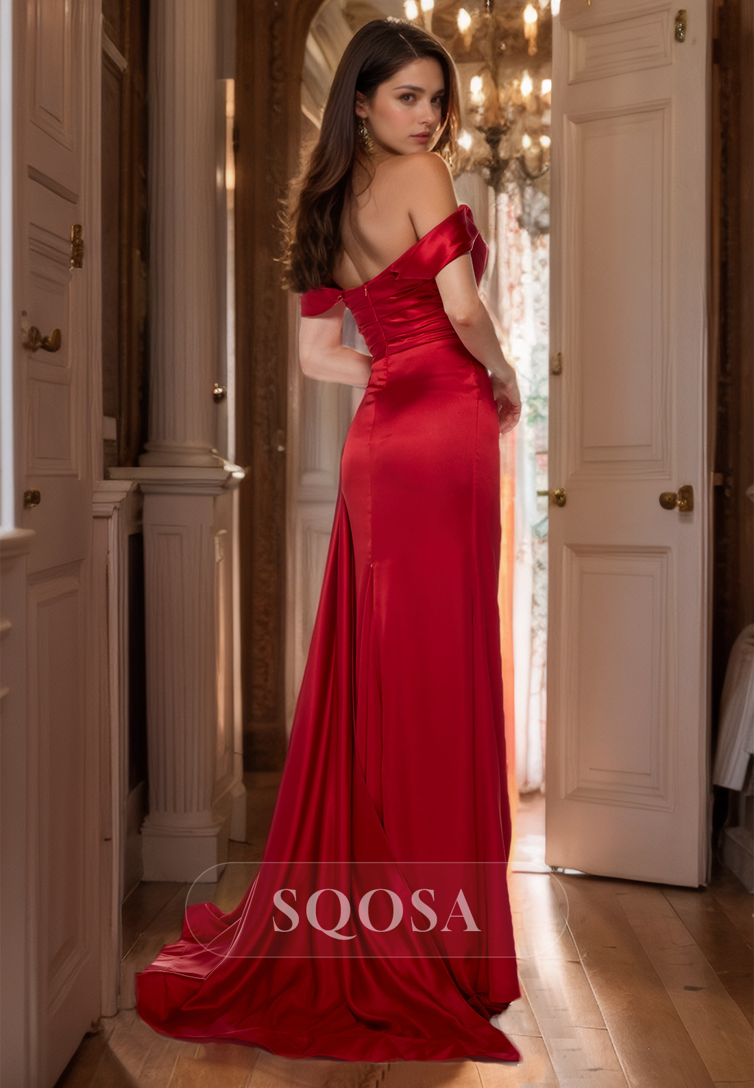 This stunning mermaid prom dress features a simple yet elegant scoop-neck and off-shoulder design, with sleeveless pleating and a high slit for added flair. The sweep train adds a touch of sophistication to this already beautiful gown. Perfect for a memorable prom night or any special occasion.