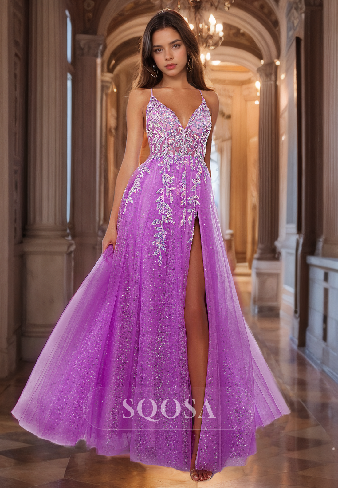 Spaghetti Straps V-Neck Glitter-Knit Formal Gowns Sleeveless Pleated Beaded Applique A-Line Prom Dress