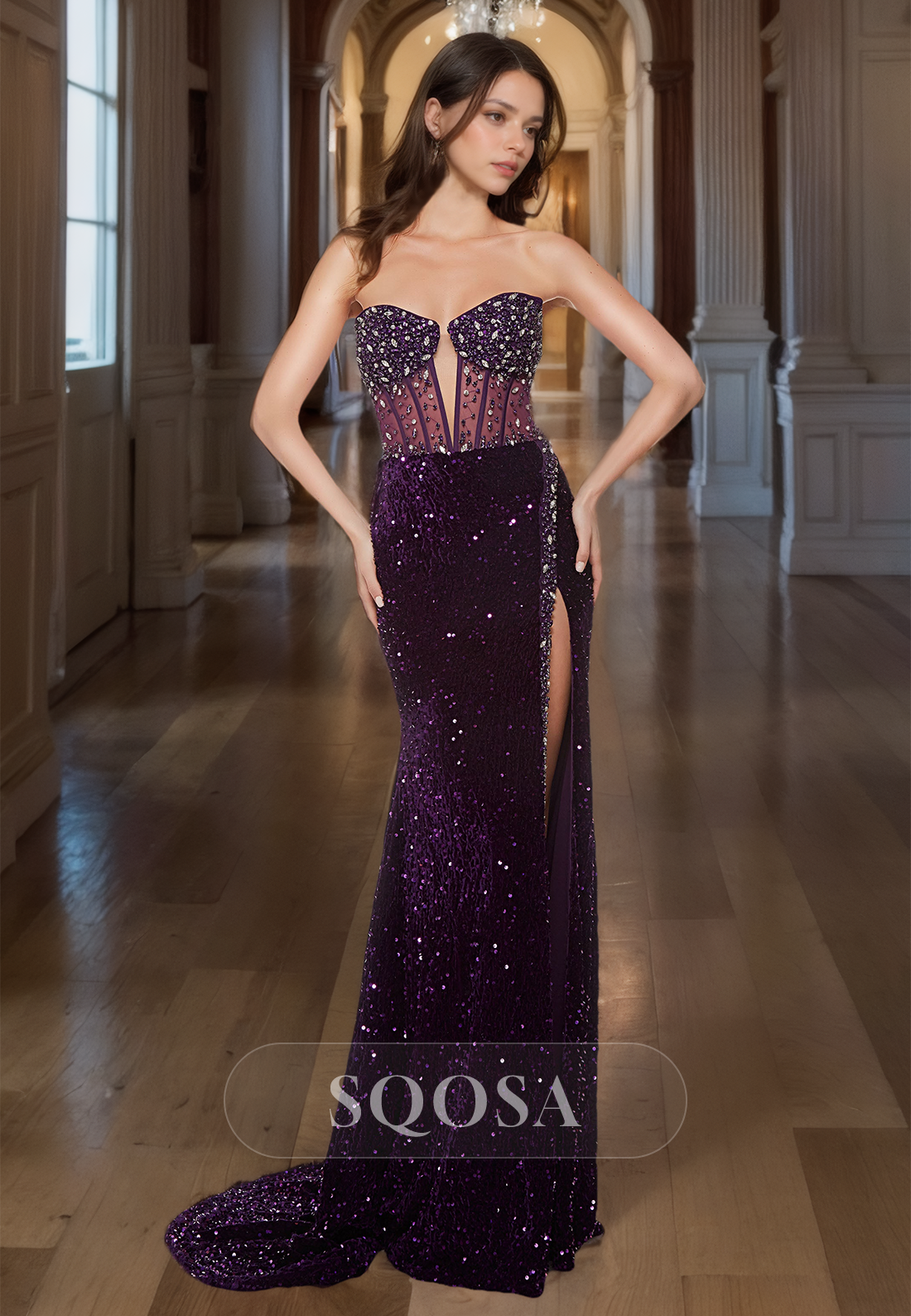 Allover Sequined Sweetheart Sleeveless Prom Dress Beaded Cutout Slit with Train Fitted Party Gowns