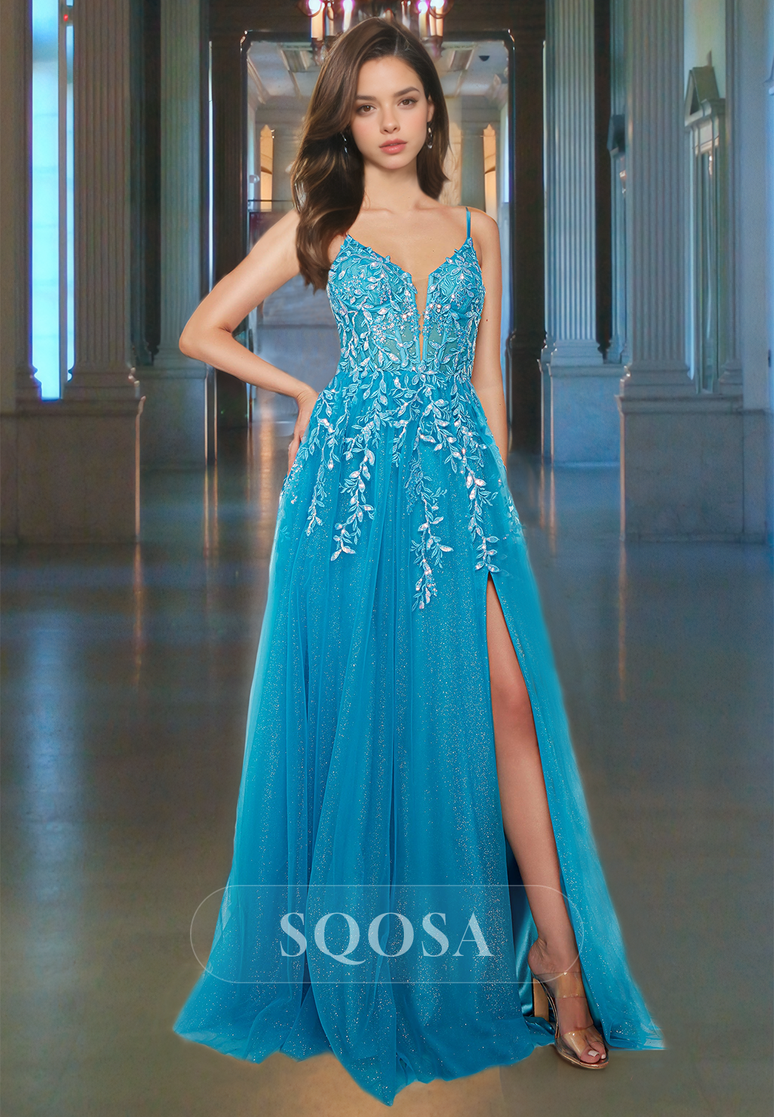V-Neck Spaghetti Straps Applique A-Line Party Gowns Sleeveless Glitter-Knit Prom Dress with Slit