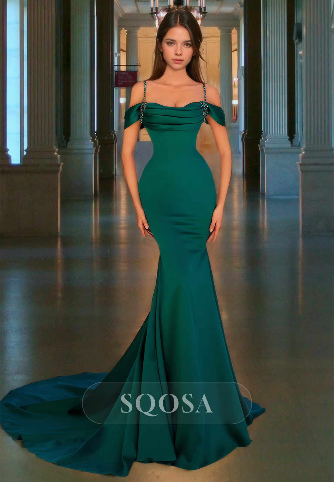 Spaghetti Straps Tube Top Off-Shoulder Sleeveless Mermaid Prom Dress Pleated Sweep Train Party Gowns