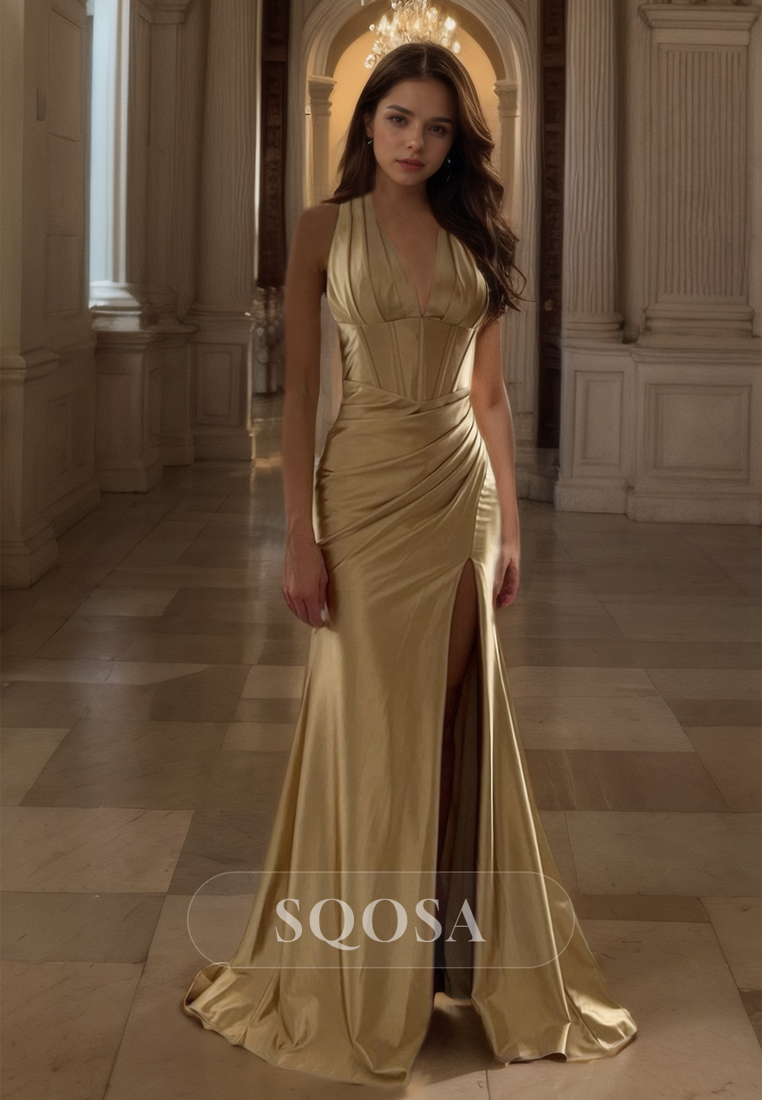 Deep V-Neck Off-Shoulder Straps Pleated Slit Satin Mermaid Prom Dress with Sweep Train