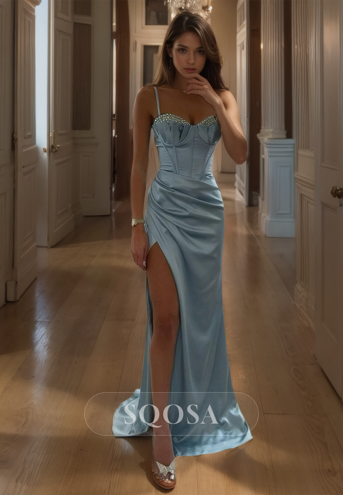 Spaghetti Straps Pleated Fitted Party Dress Sleeveless Sweetheart Beaded Slit with Train Prom Dress