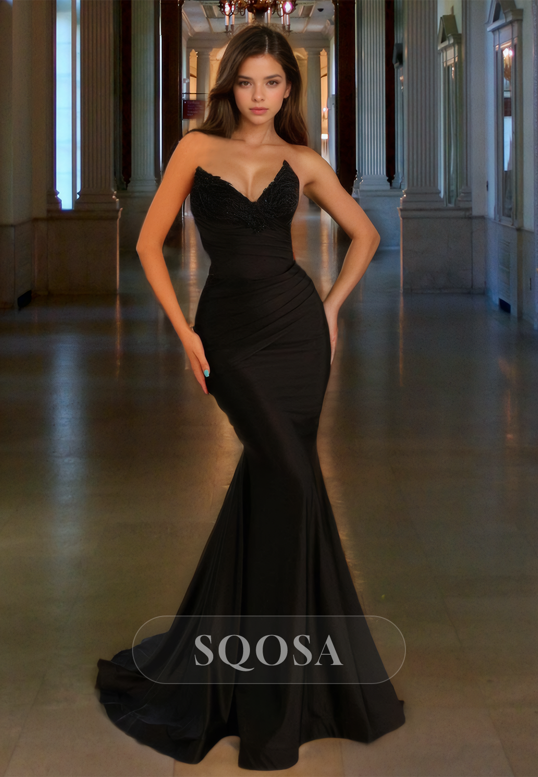 Off-Shoulder Sleeveless V-Neck Mermaid Prom Dress Beaded Applique Pleated Party Dress with Sweep Train