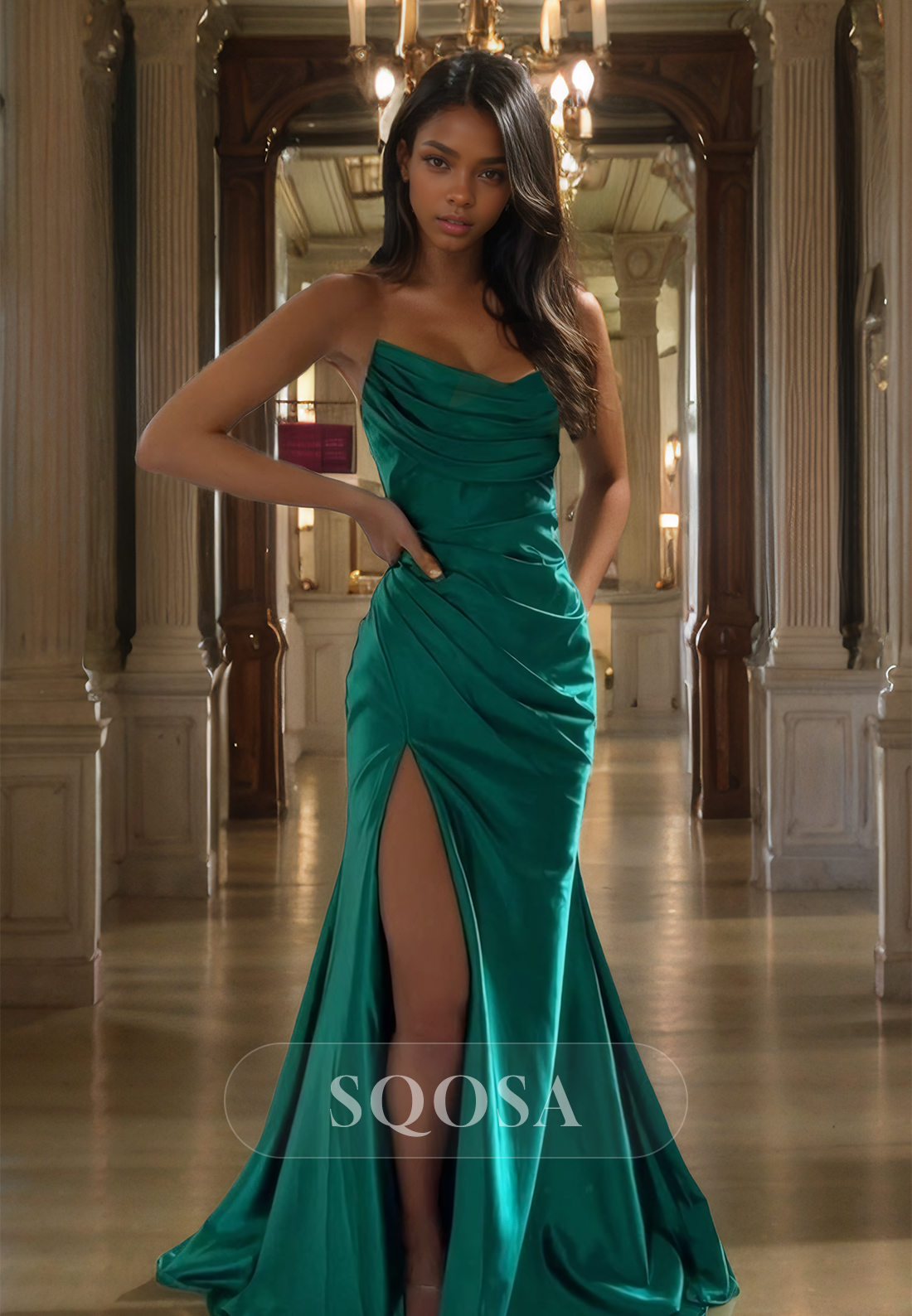 Tube Top Sleeveless Pleated Fiffed Prom Dress Off-Shoulder Slit with Train for Formal Dinner Party