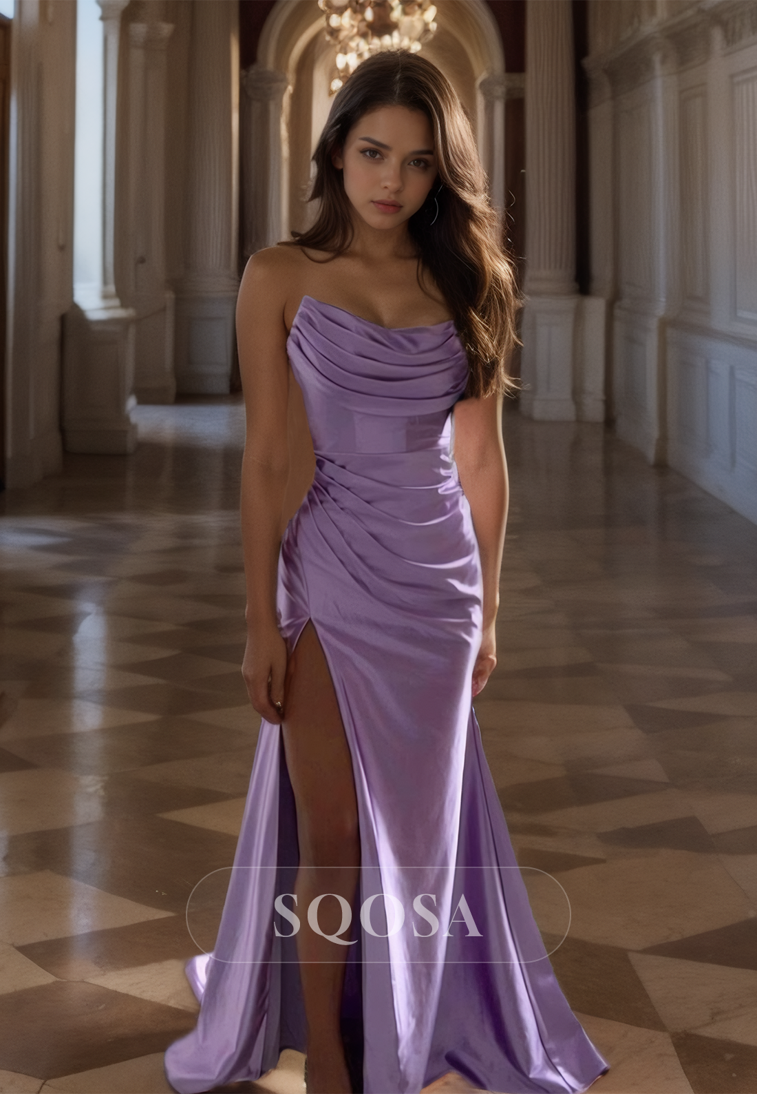 Tube Top Off-Shoulder Sleeveless Meramid Prom Dress Pleated Slit Sweep Train Evening Gowns