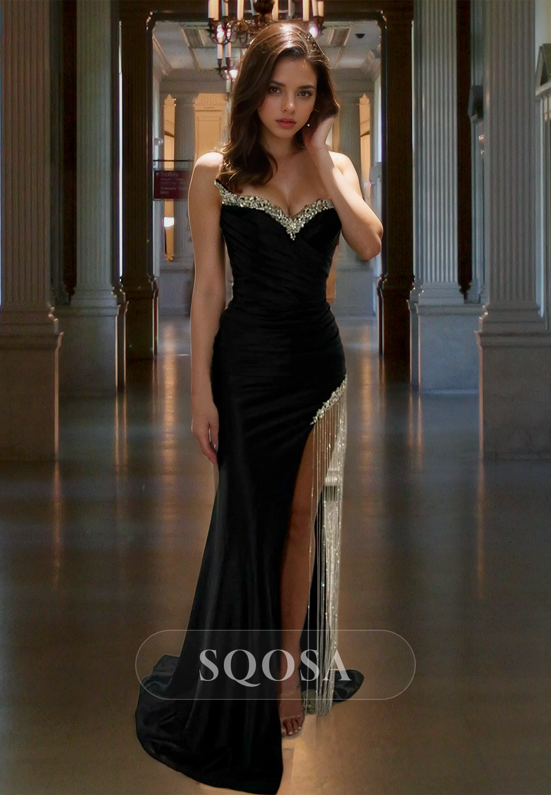 Beaded Sweetheart Sleeveless Beaded Mermaid Prom Dress Off-Shoulder Fringed Pleated Dinner Gowns