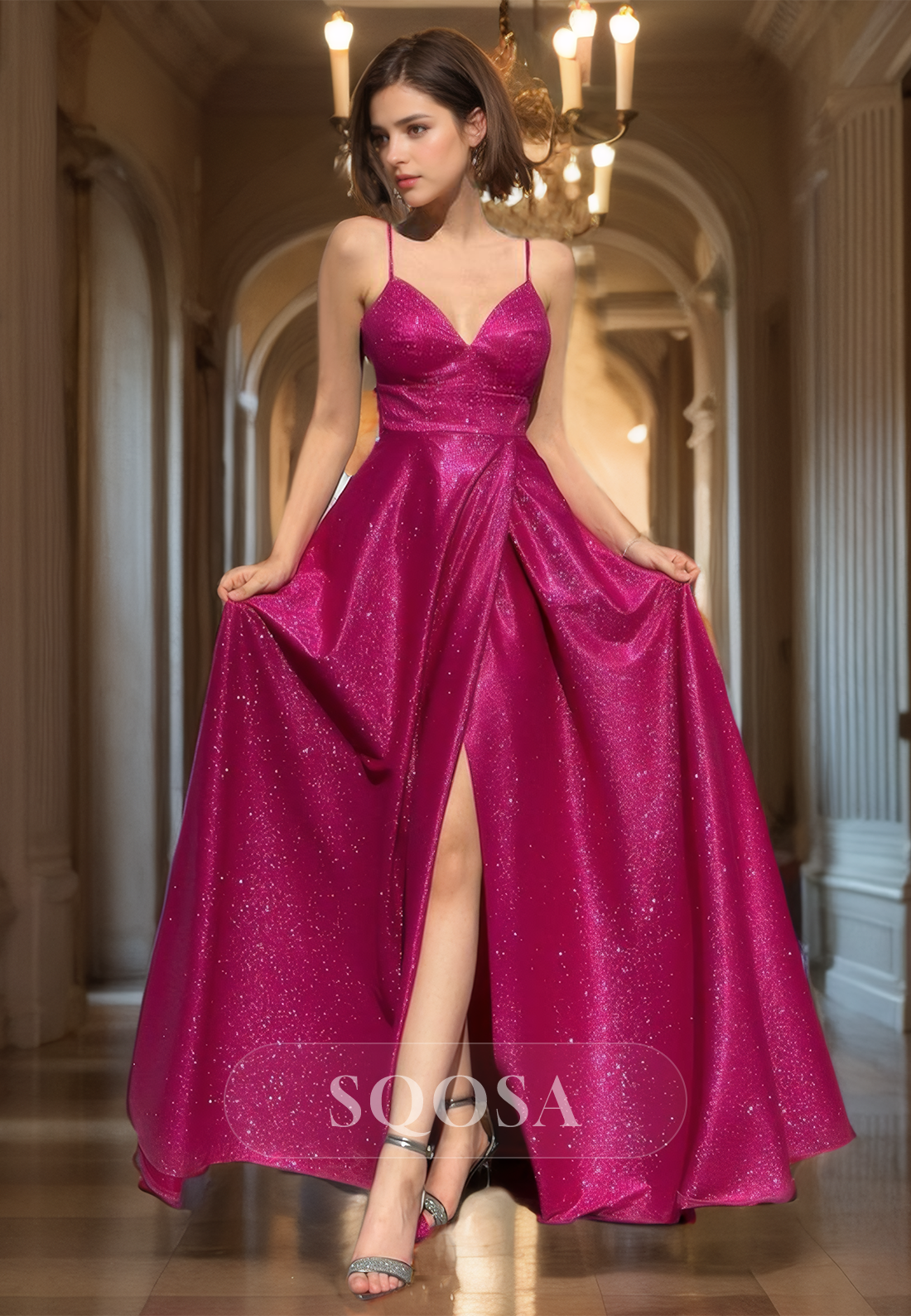 A-Line Spaghetti Straps V-Neck Off-Shoulder Glitter-Knit Pleated Prom Dress with High Slit