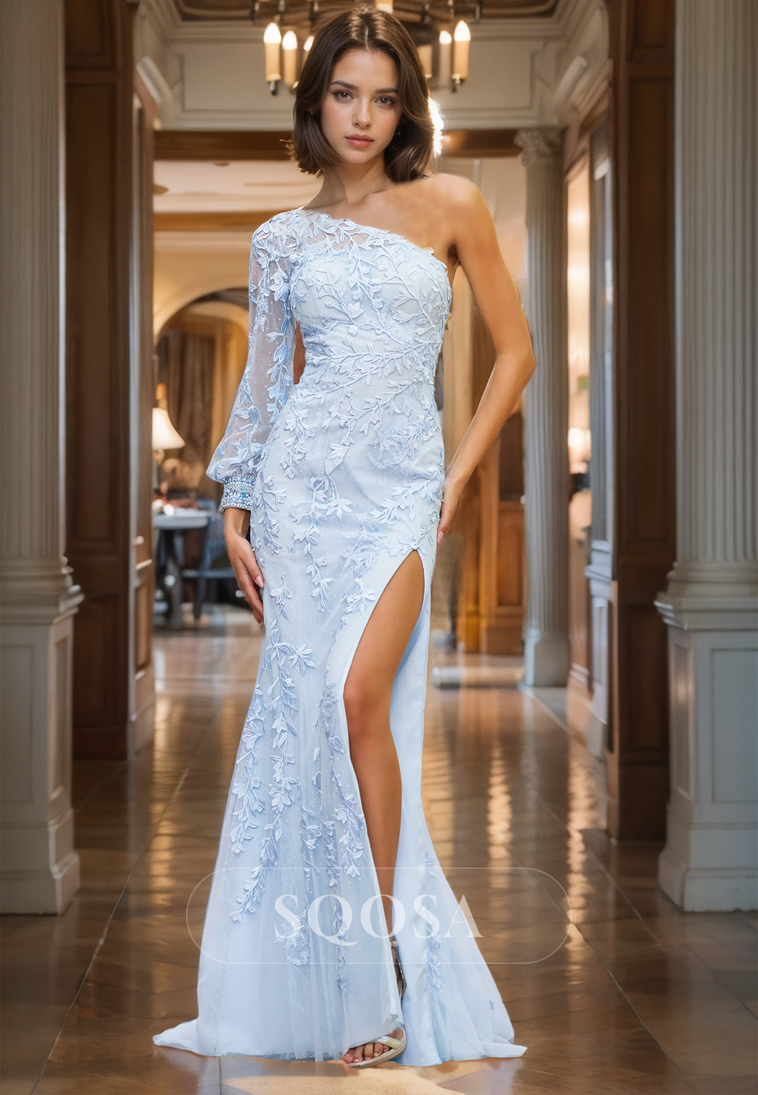 Asymmetrical-Neck Long One Sleeve Formal Gowns Lace Applique High Slit Mermaid Prom Dress with Train
