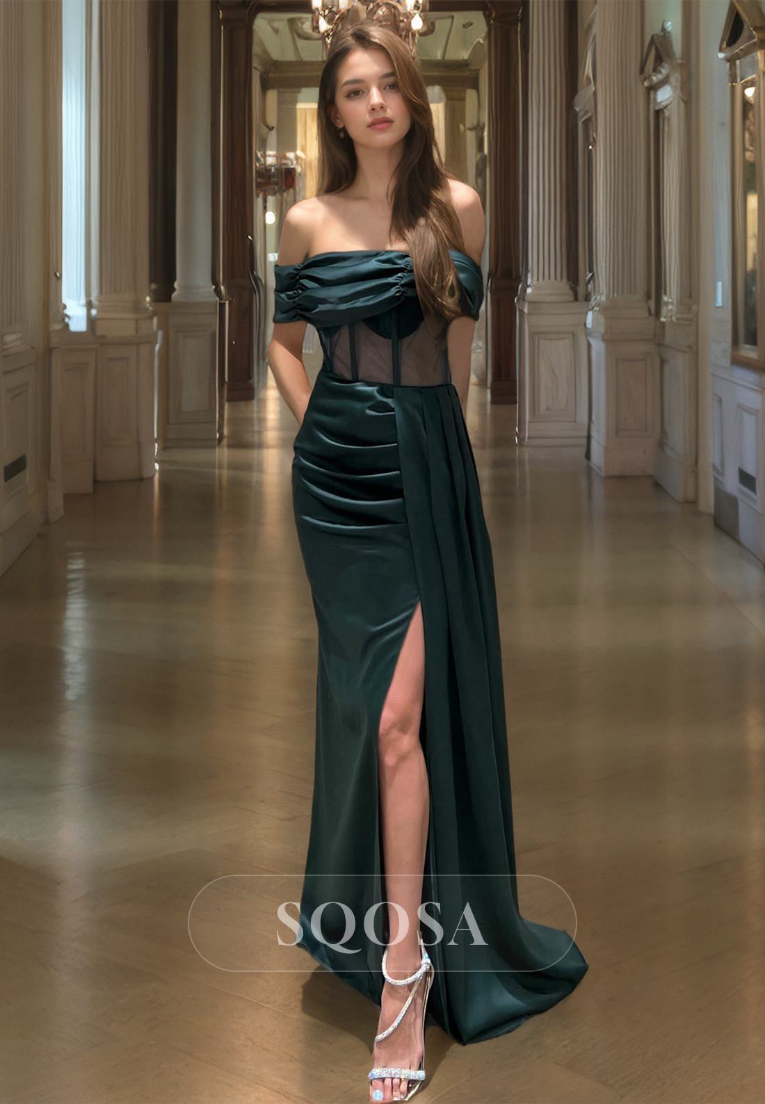 Tube Top Off-Shoulder Satin Mermaid Prom Dress Pleated Floor-Length Party Gowns with High Slit x 1;