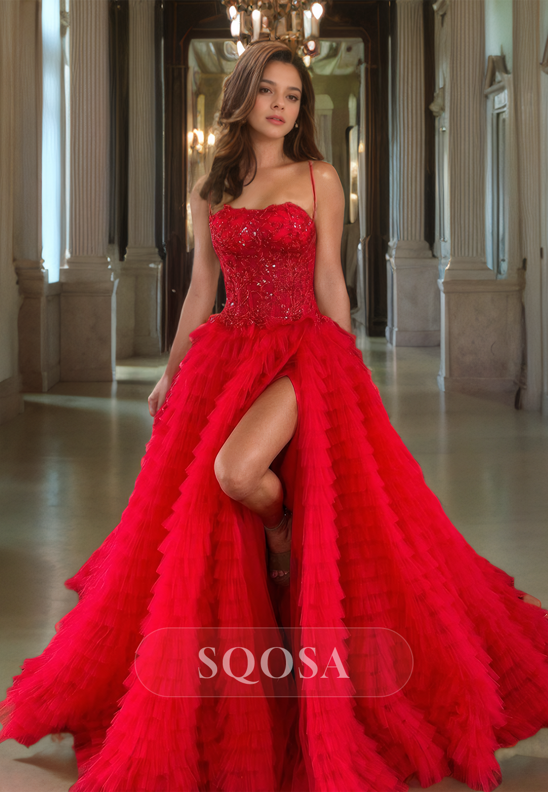 A-Line Spaghetti Straps Tube Top Formal Prom Dress Off-Shoulder Applique Tulle Slit Party Gowns with Train