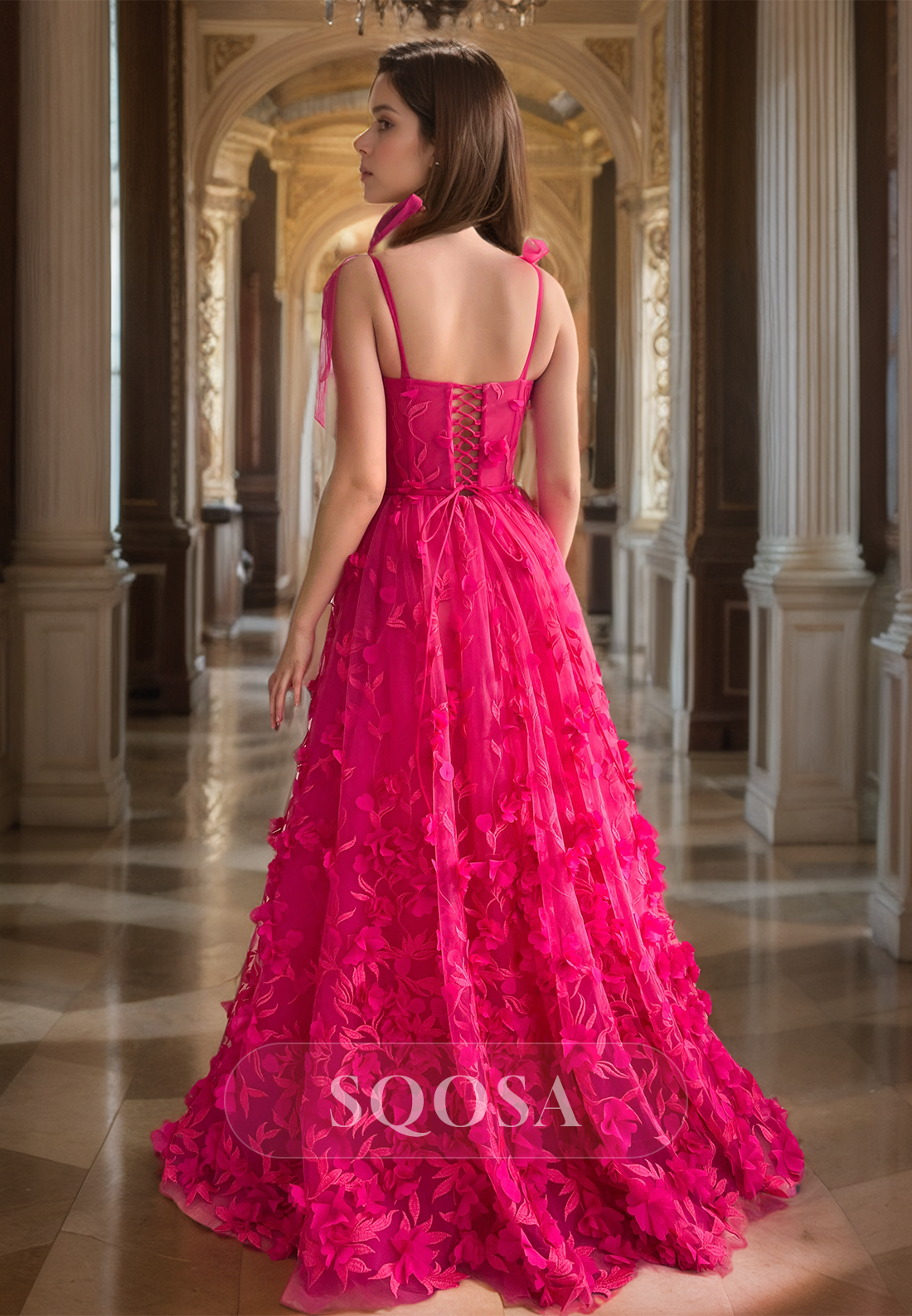 Square-Neck Spaghetti Straps Pleated Evening Gowns Allover Lace Applique A-Line Prom Dress