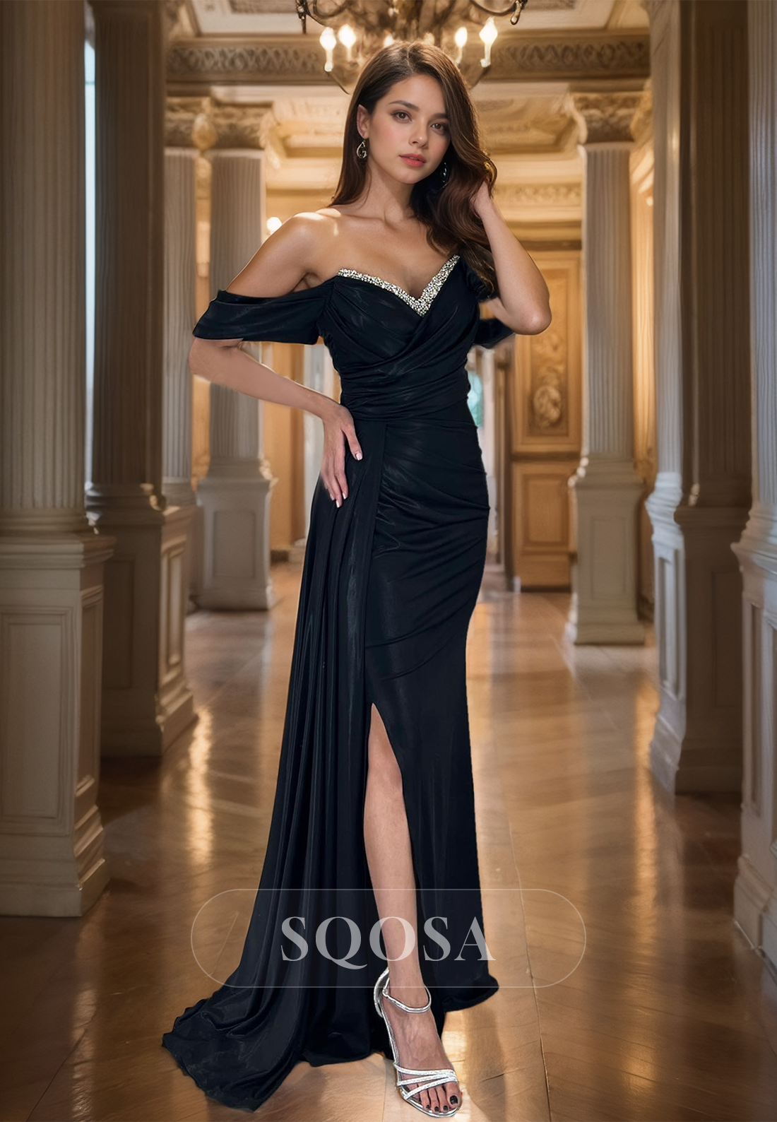 Beaded V-Neck Off-Shoulder Mermaid Prom Dress Sleeveless Pleated Sweep Train Formal Gowns x 1;