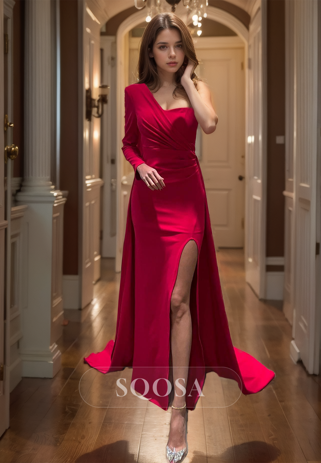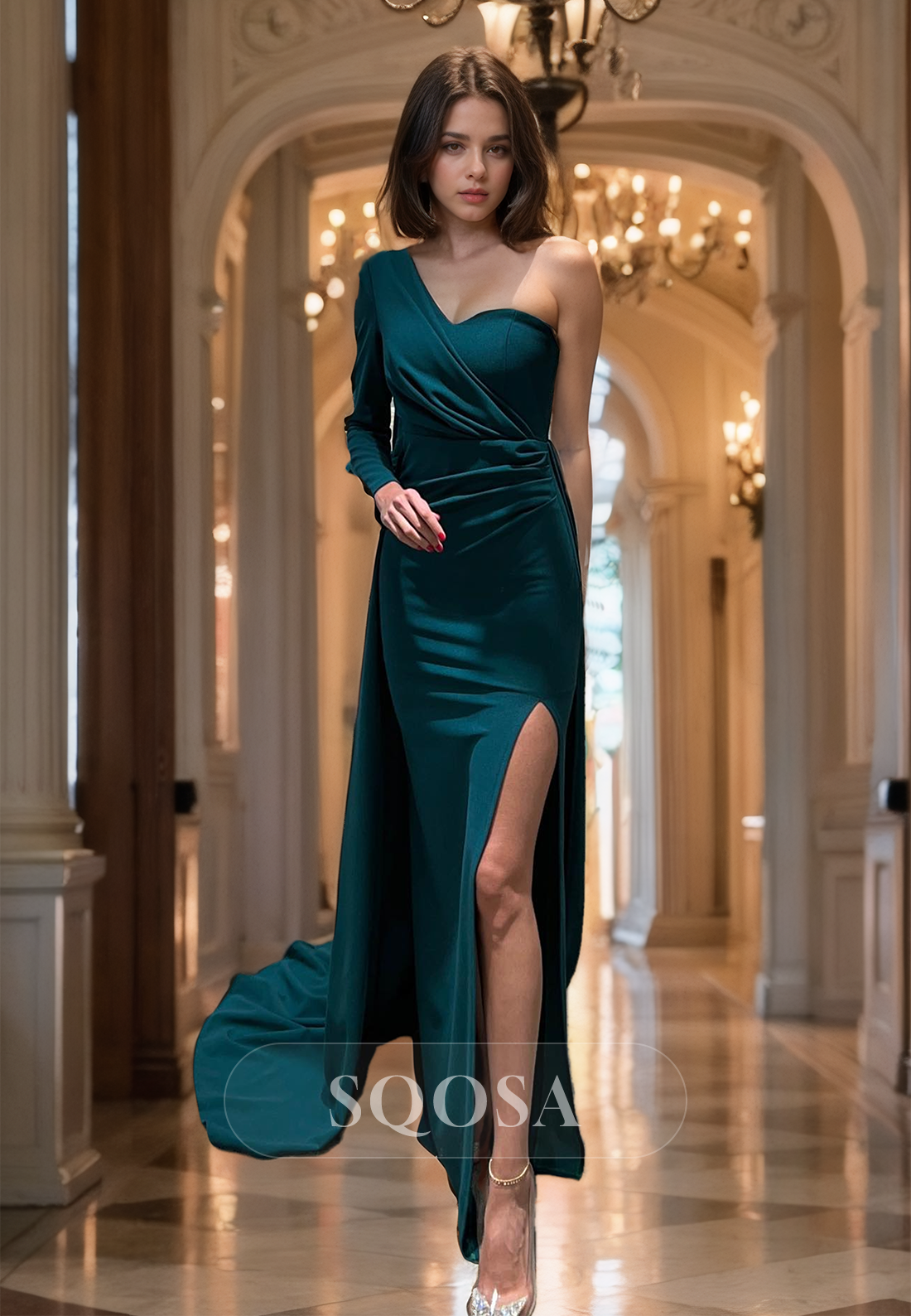 One Long-Sleeves Slit Sweep Train Satin Party Gowns Asymmetrical-Neck Mermaid Prom Dress x 1;