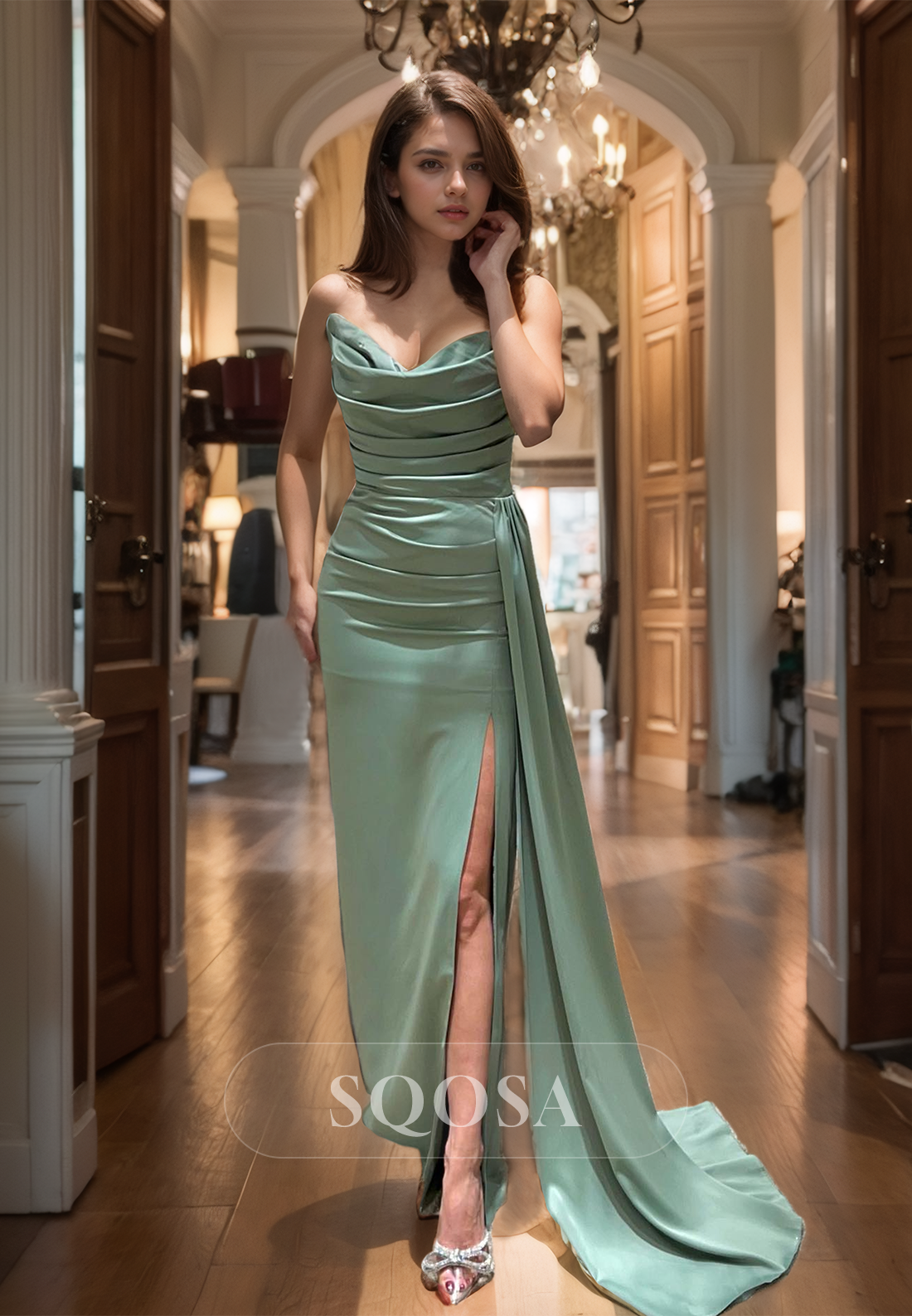 Expertly crafted with a sweetheart neckline, off-shoulder straps, and a pleated high slit, this mermaid prom dress exudes elegance and sophistication. Made of satin with a sweep train, it offers a perfect fit and comfort for a glamorous evening.