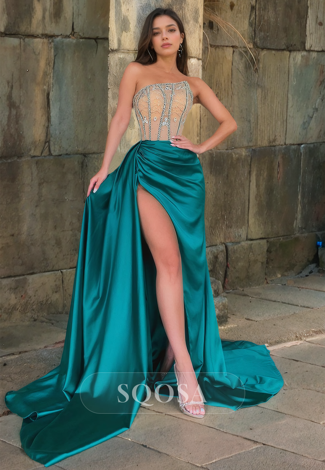 Asymmetrical Tube Top Sleeveless Beaded A-Line High Slit Formal Prom Dress with Sweep Train