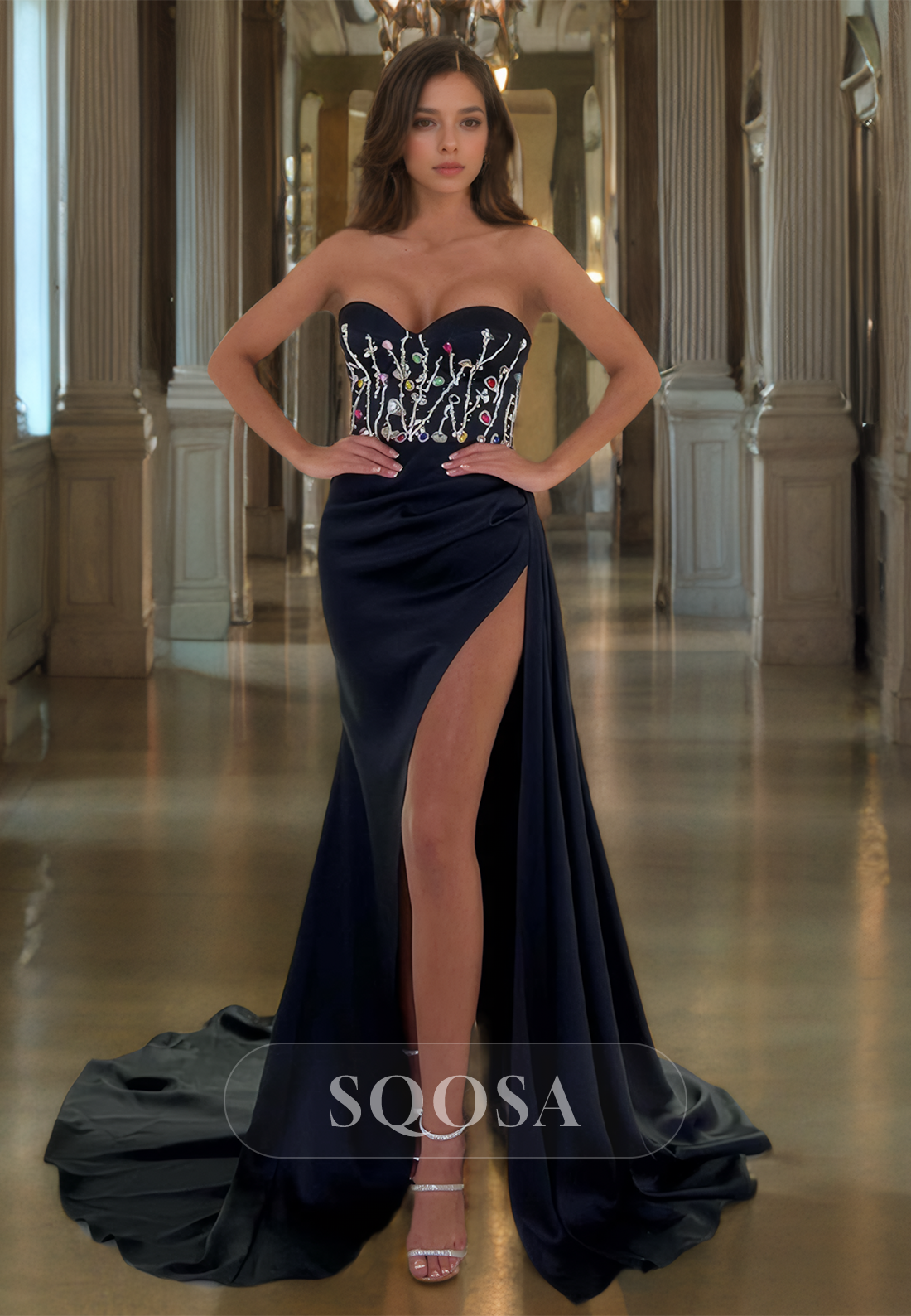 Sleeveless Sweetheart Off-Shoulder High Slit Sweep Train Fitted Formal Prom Dress with Beaded and Rhinestone
