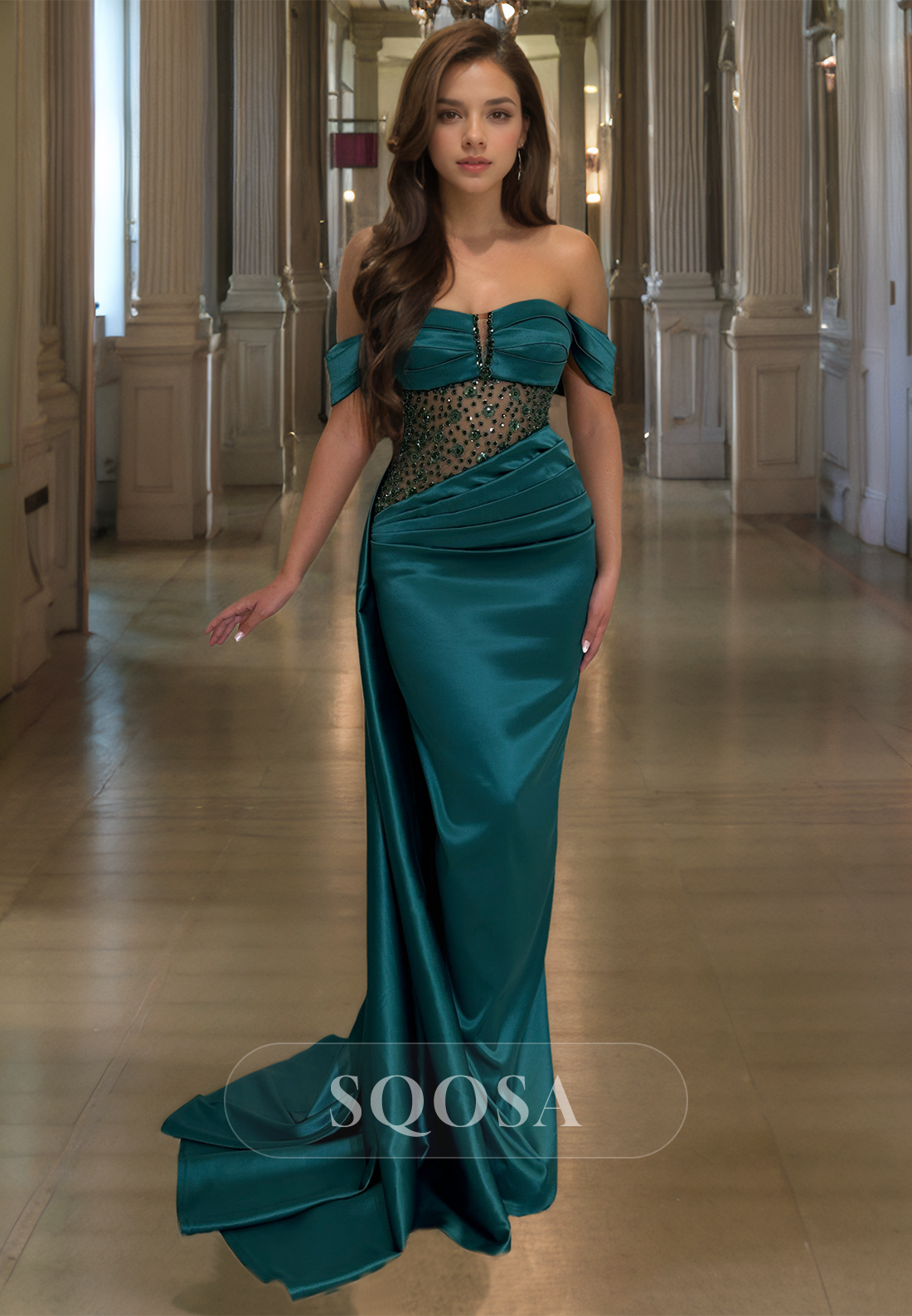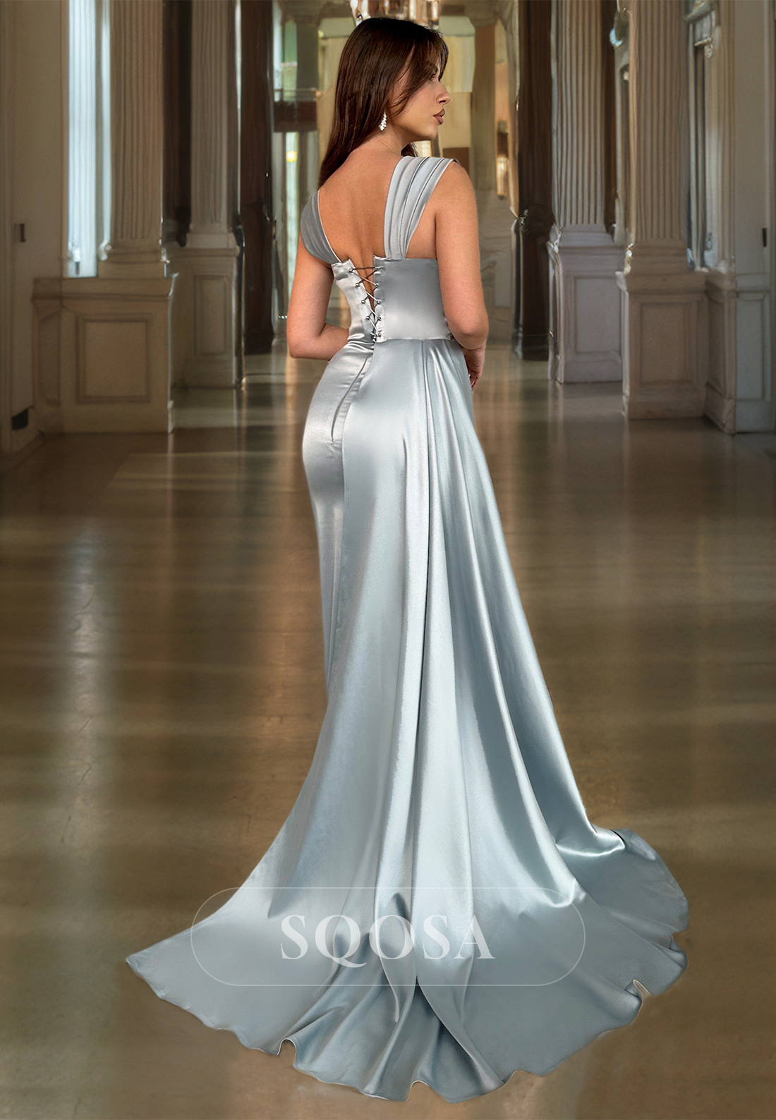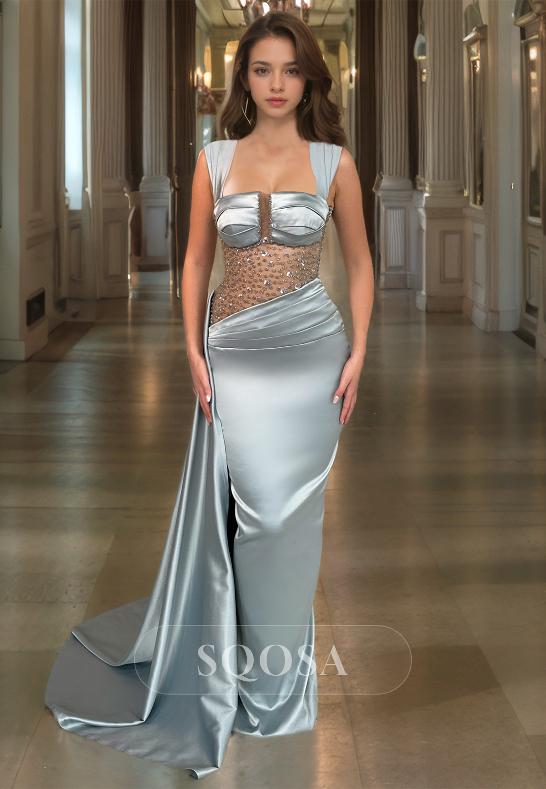 Tube Top Pleated Straps Sleeveless Beaded Cutout with Sweep Train Formal Mermaid Prom Dress