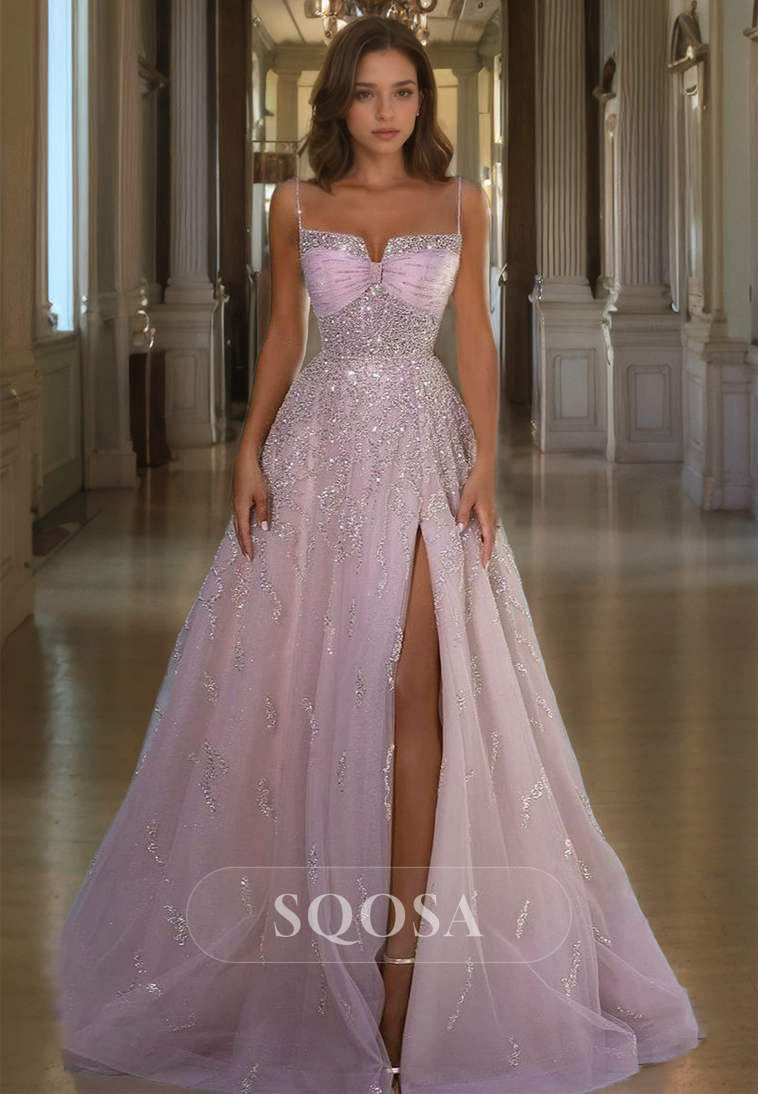 Sweetheart Sleeveless Beaded Applique A-Line Prom Dress Spaghetti Straps Pleated High Slit Party Gowns