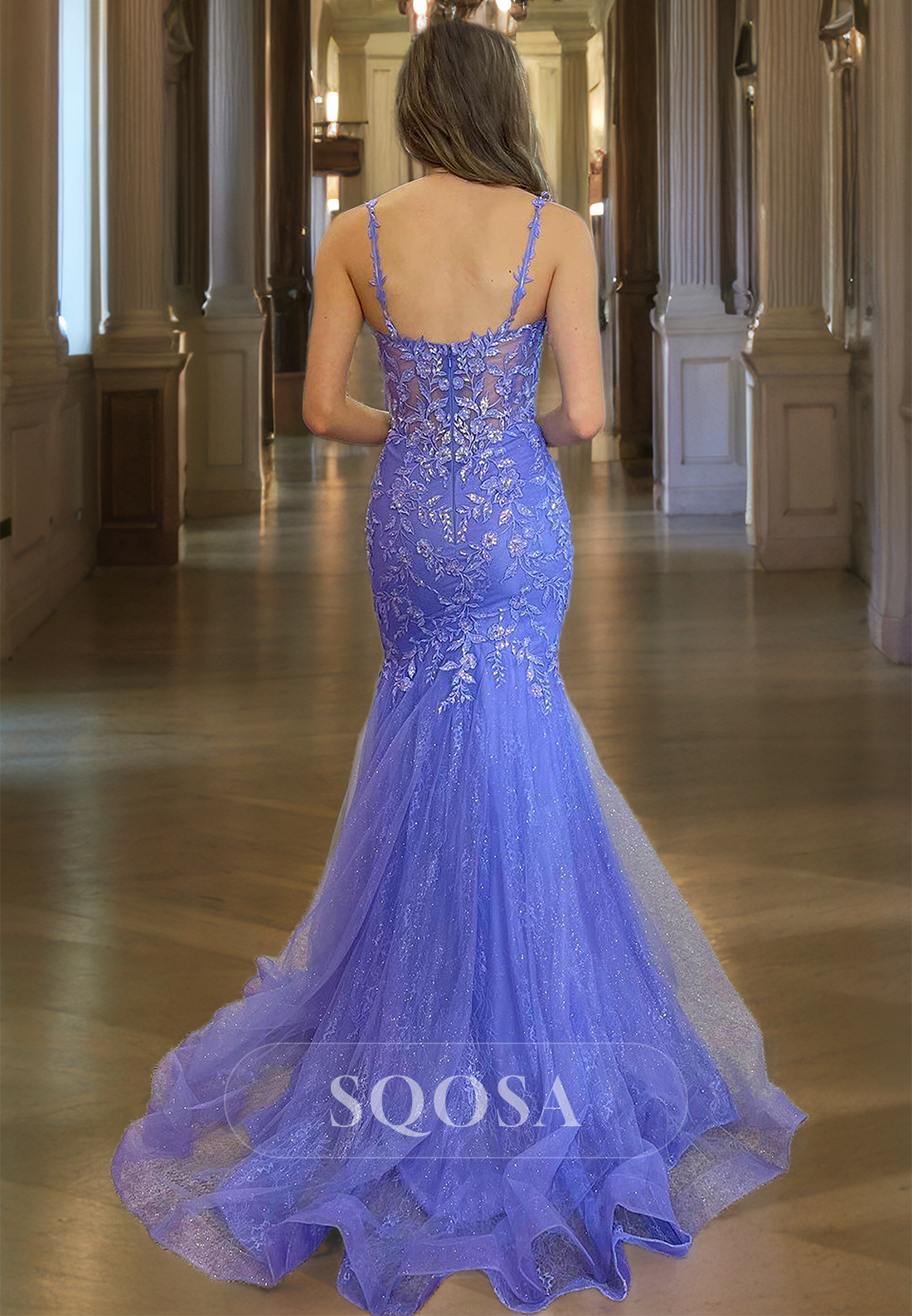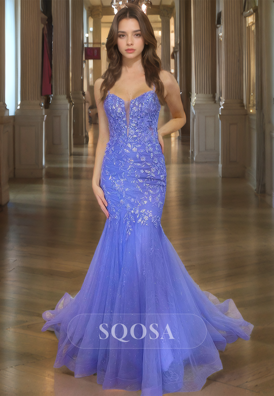 Spaghetti Straps Sweetheart Sleeveless Mermaid Prom Dress Foliage Motif Applique Formal Gowns