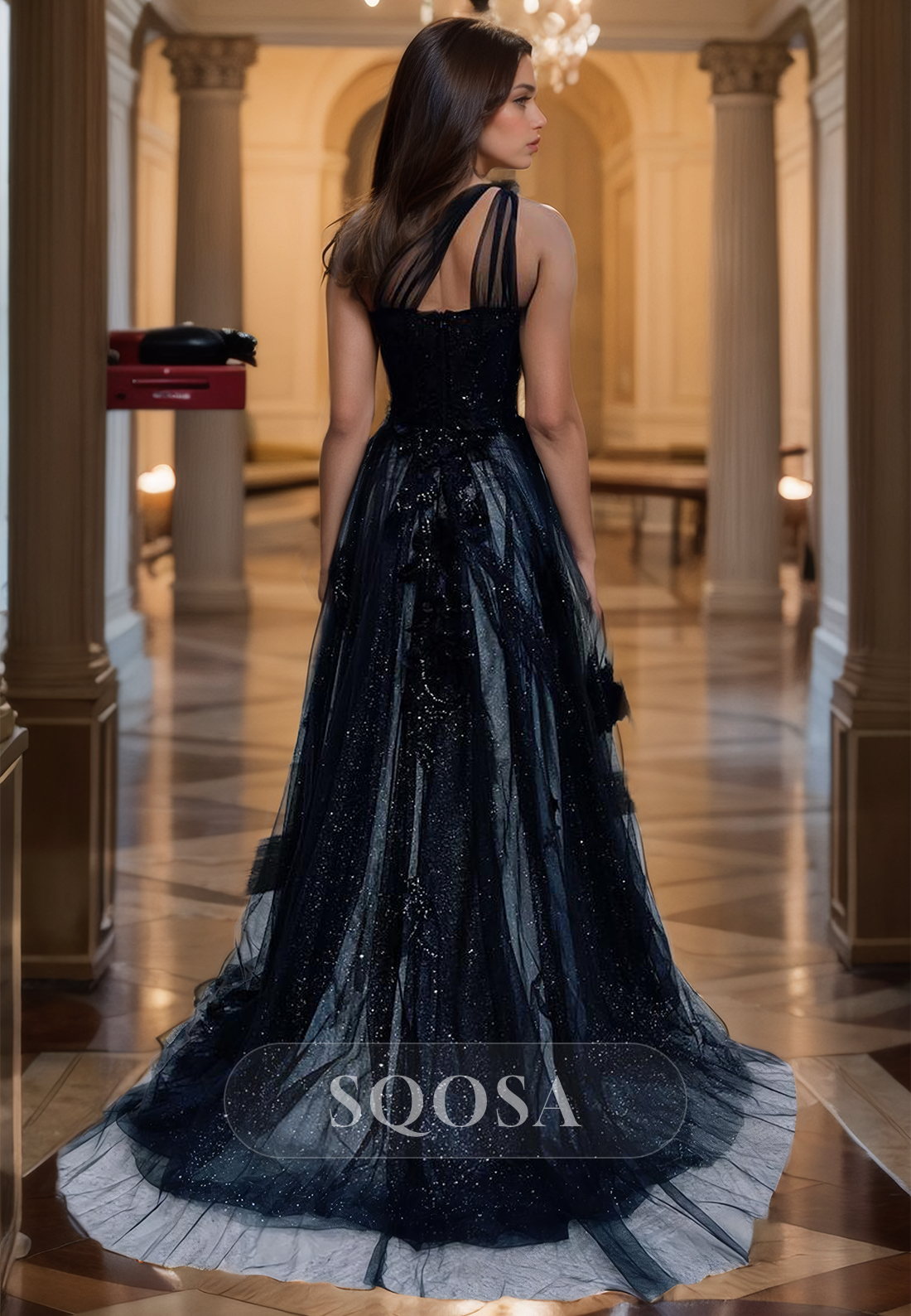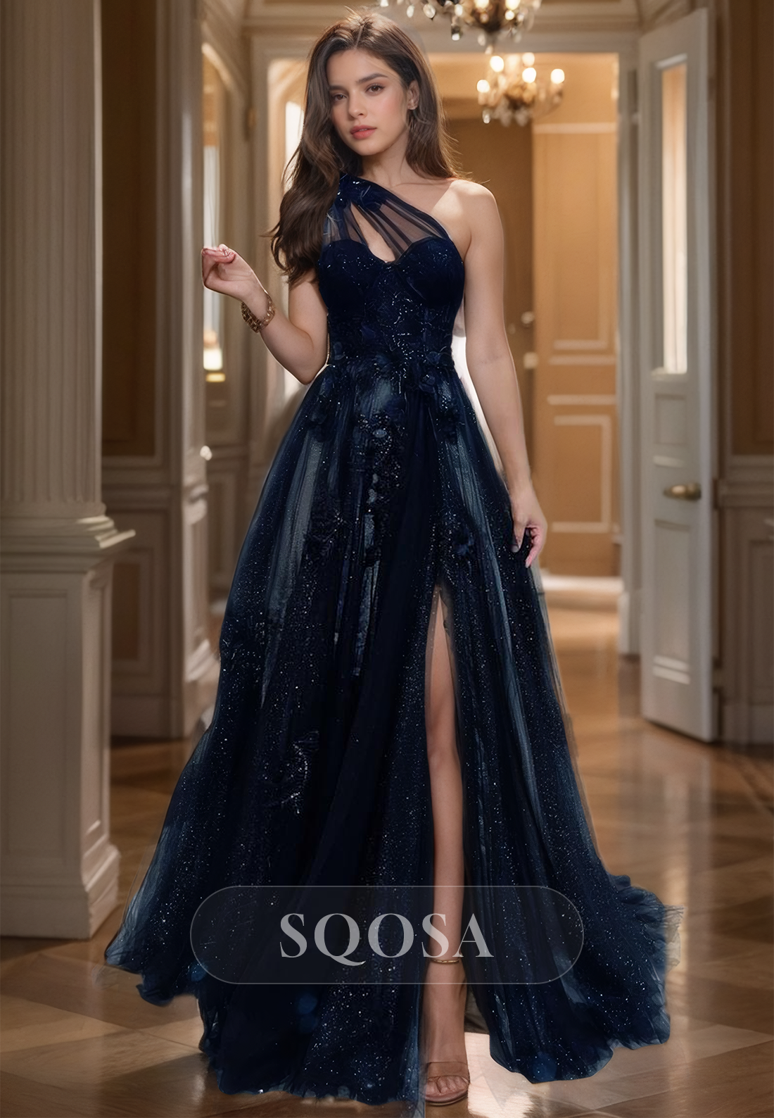 A-Line Sweetheart Sleeveless One-Strap Prom Dress Beaded Applique Pleated Evening Gowns with High Slit