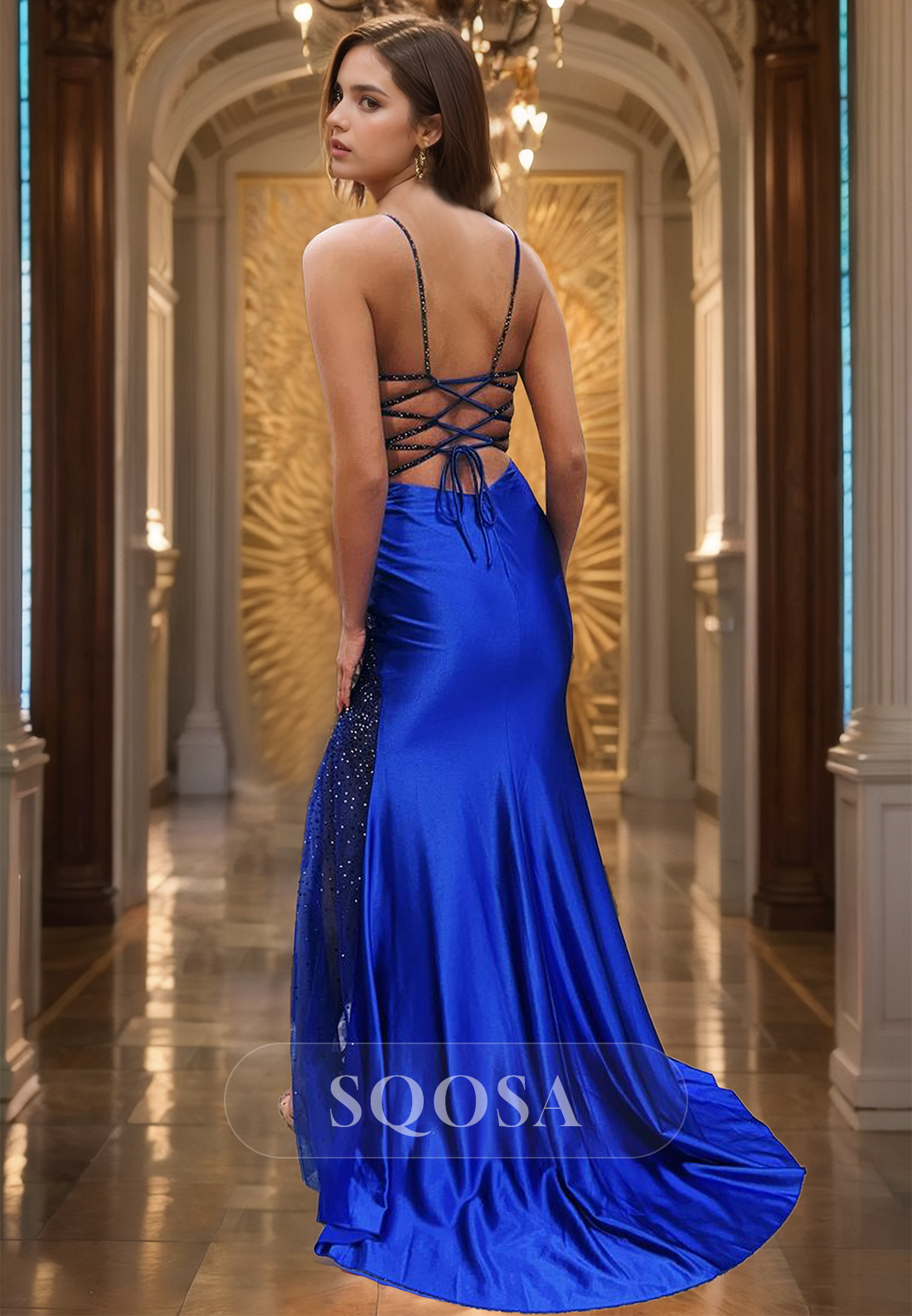Spaghetti Straps V-Neck Off-Shoulder Mermaid Prom Dress Sleeveless Pleated Beaded Evening Gowns