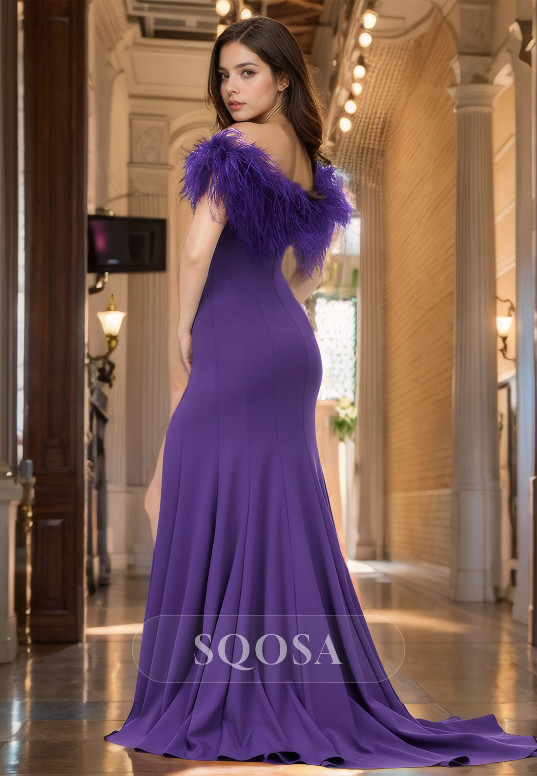 V-Neck Off-Shoulder Sleeveless High Slit Party Gowns Fringed Sweep Train Mermaid Prom Dress x 1;