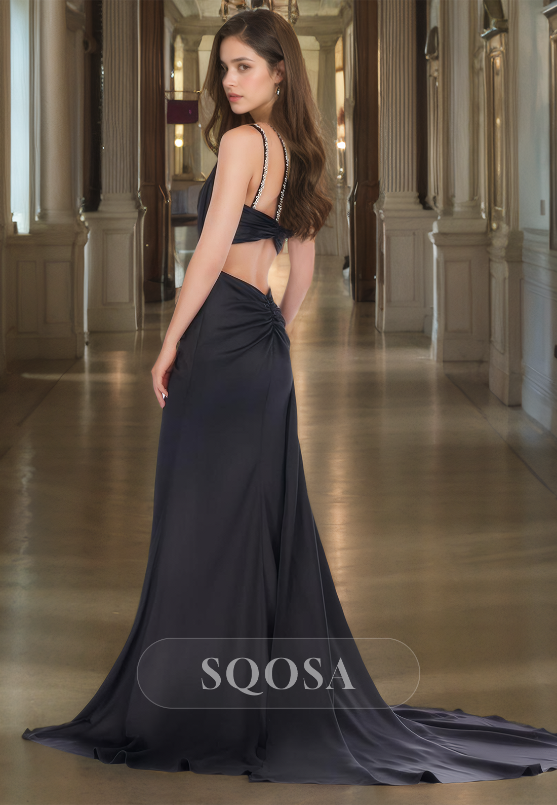 Asymmetrical-Neck Spaghetti Straps Sleeveless Party Gowns Pleated Beaded Slit Fitted Prom Dress