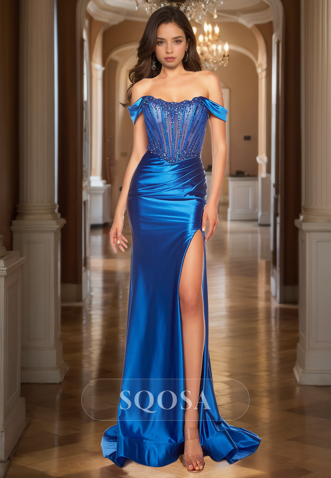 Scoop-Neck Off-Shoulder Sleeveless Formal Gowns Beaded Pleated High Slit Mermaid Prom Dress x 1;