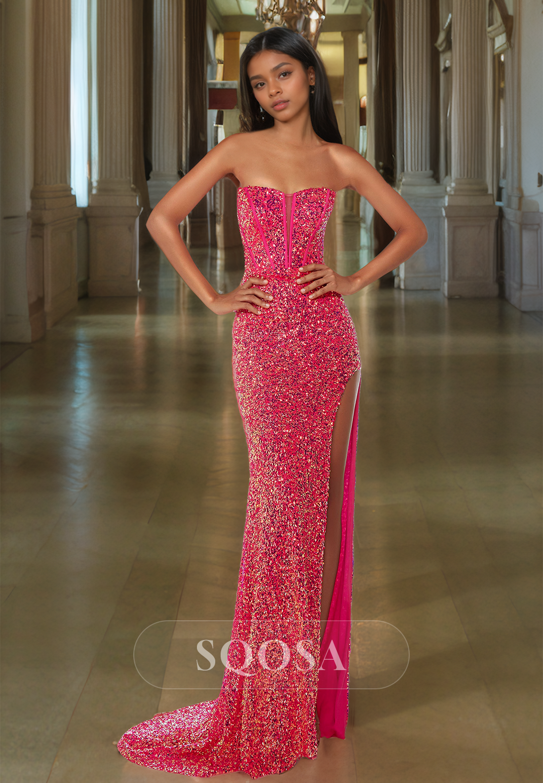 Sleeveless Sweetheart Mermaid Formal Gowns Fully Sequined High Slit Sweep Train Prom Dress x 1;
