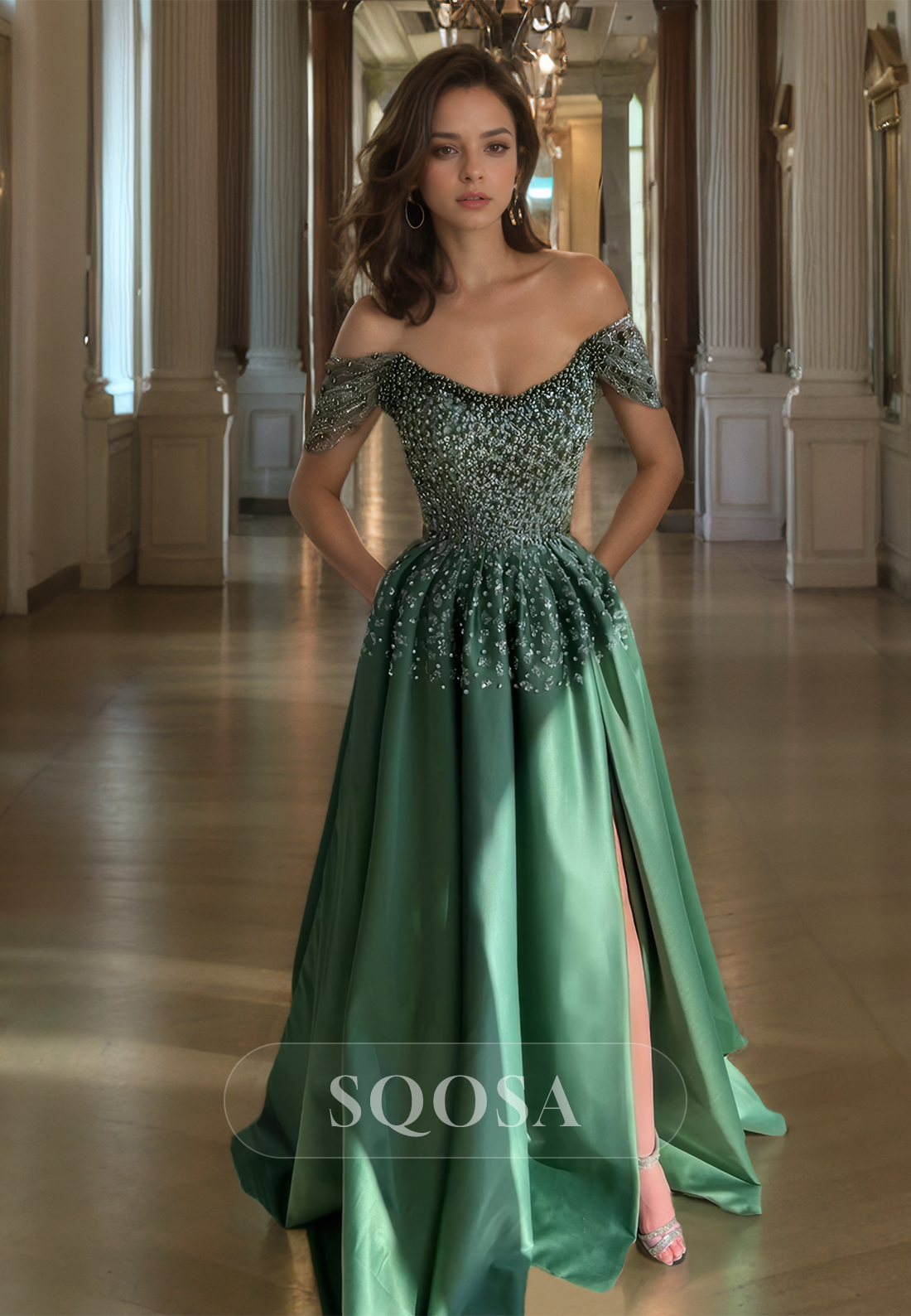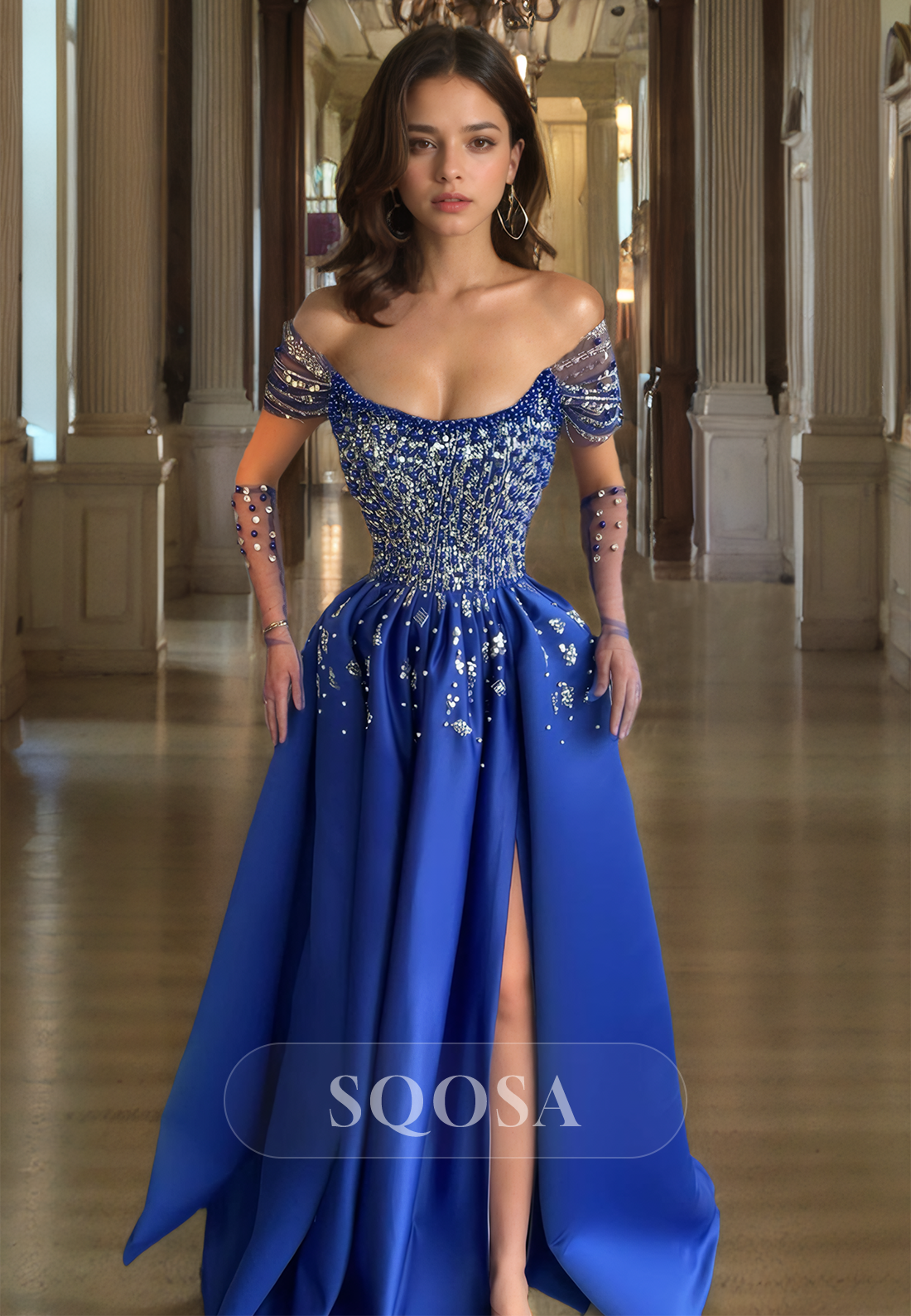 Scoop-Neck Tulle Gloves A-Line Prom Dress Beaded Pleated Floor-Length Slit Formal Dinner Gowns x 1;