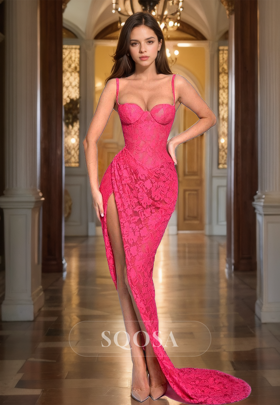Enhance your prom look with this stunning mermaid-style dress. Featuring a sweetheart neckline, delicate spaghetti straps, and elegant lace applique, this dress will make you stand out from the crowd. With a high slit and sweep train, it's the perfect combination of sexy and sophisticated. Make a statement and turn heads at your prom with this gorgeous dress.