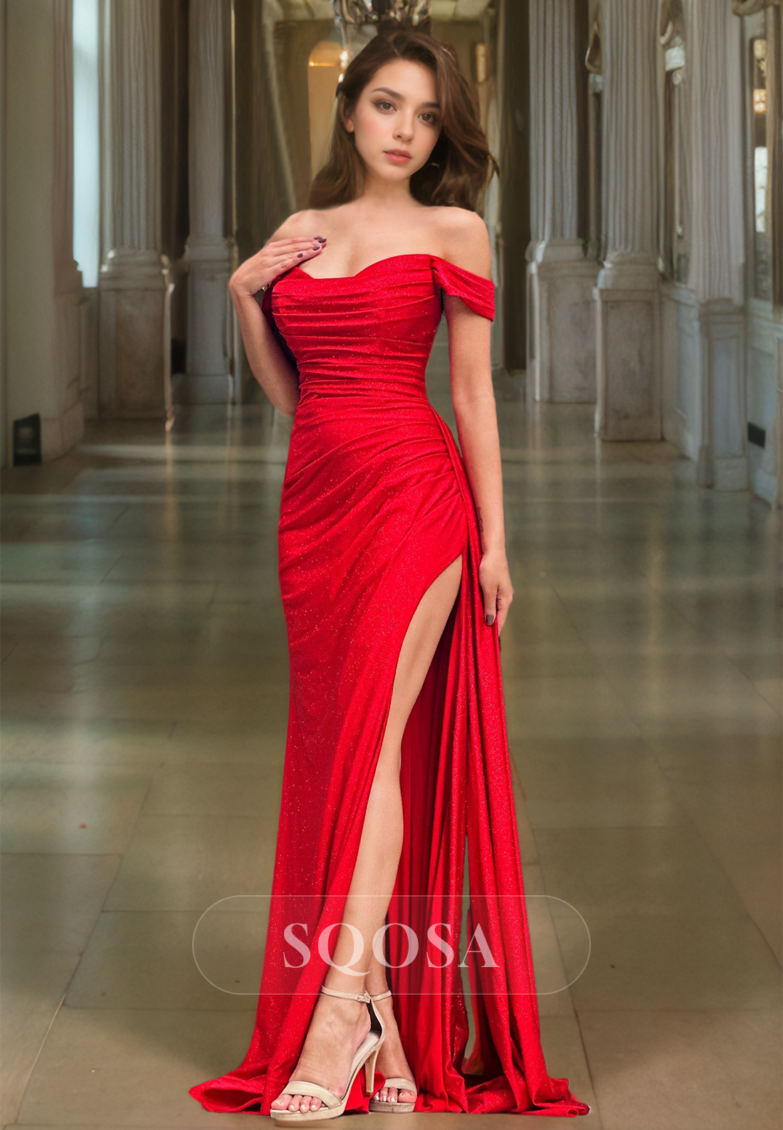 Sleeveless Sweetheart Glitter-Knit Prom Dress Pleated Sweep Train High Slit Formal Gowns