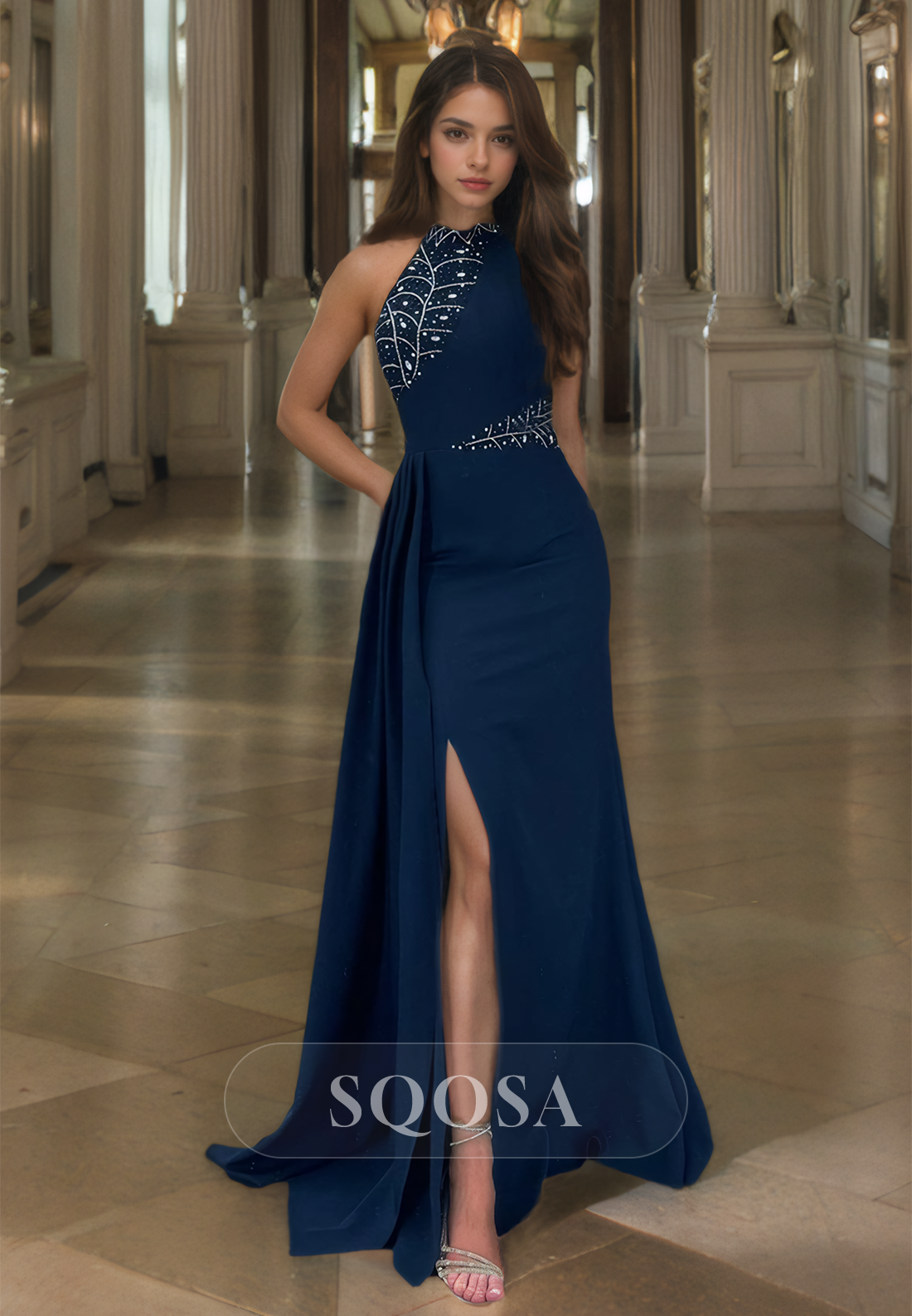 Elevate your formal ensemble with our High Scoop-Neck Off-Shoulder Sleeveless Beaded Pleated Floor-Length Mermaid Formal Prom Dress. With a sleek and flattering silhouette, this dress is embellished with delicate beading and features a high scoop-neck and off-shoulder style. Perfect for prom or any special occasion.