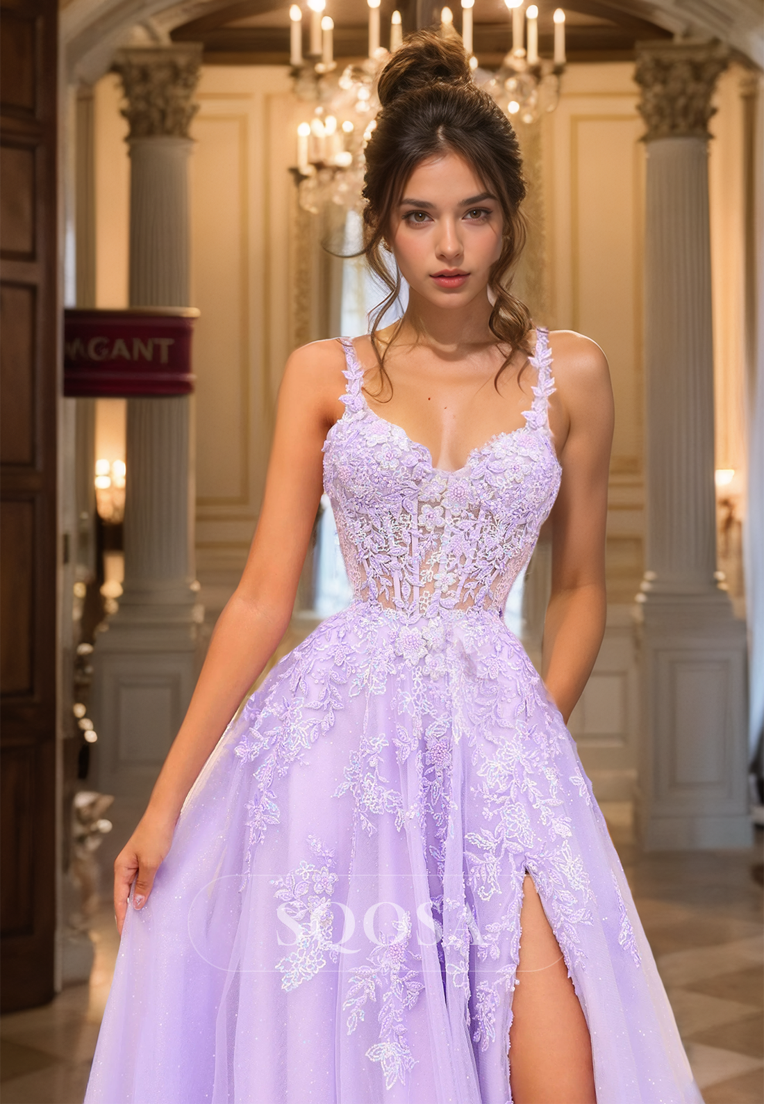 Sweetheart Spaghetti Straps Sleeveless Evening Dress Lace Applique Glitter-Knit A-Line Prom Dress