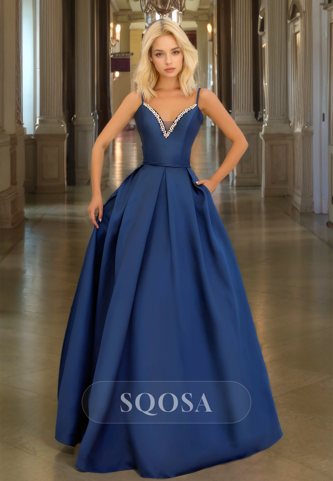 This elegant A-line party dress features a stunning beaded V-neck and delicate spaghetti straps. Made from high-quality satin, it boasts a flowy and figure-flattering silhouette with a floor-length pleated skirt. Perfect for any special occasion, this sleeveless dress is sure to turn heads with its timeless design.