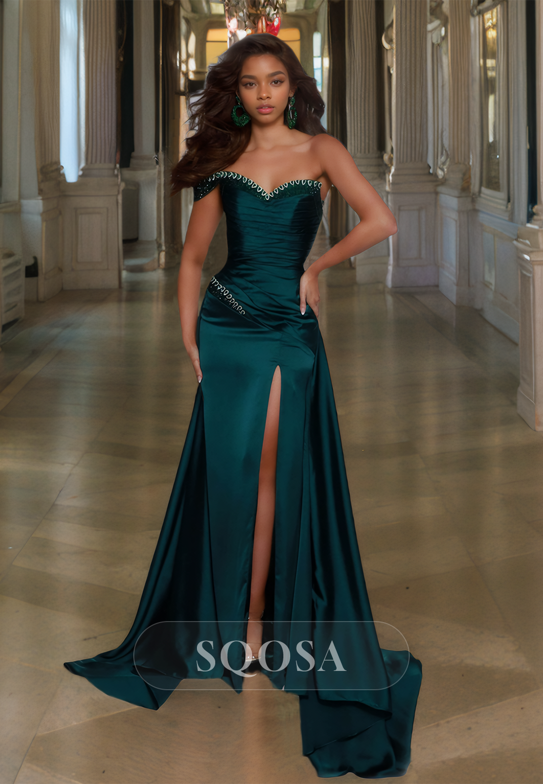 Sweetheart Sleeveless Mermaid Formal Prom Dress Beaded Pleated Slit DInner Gowns with Train
