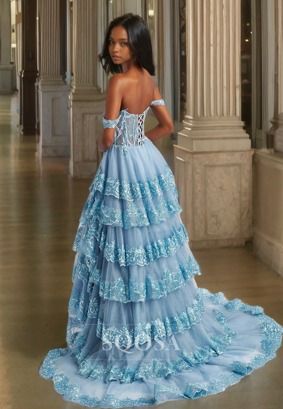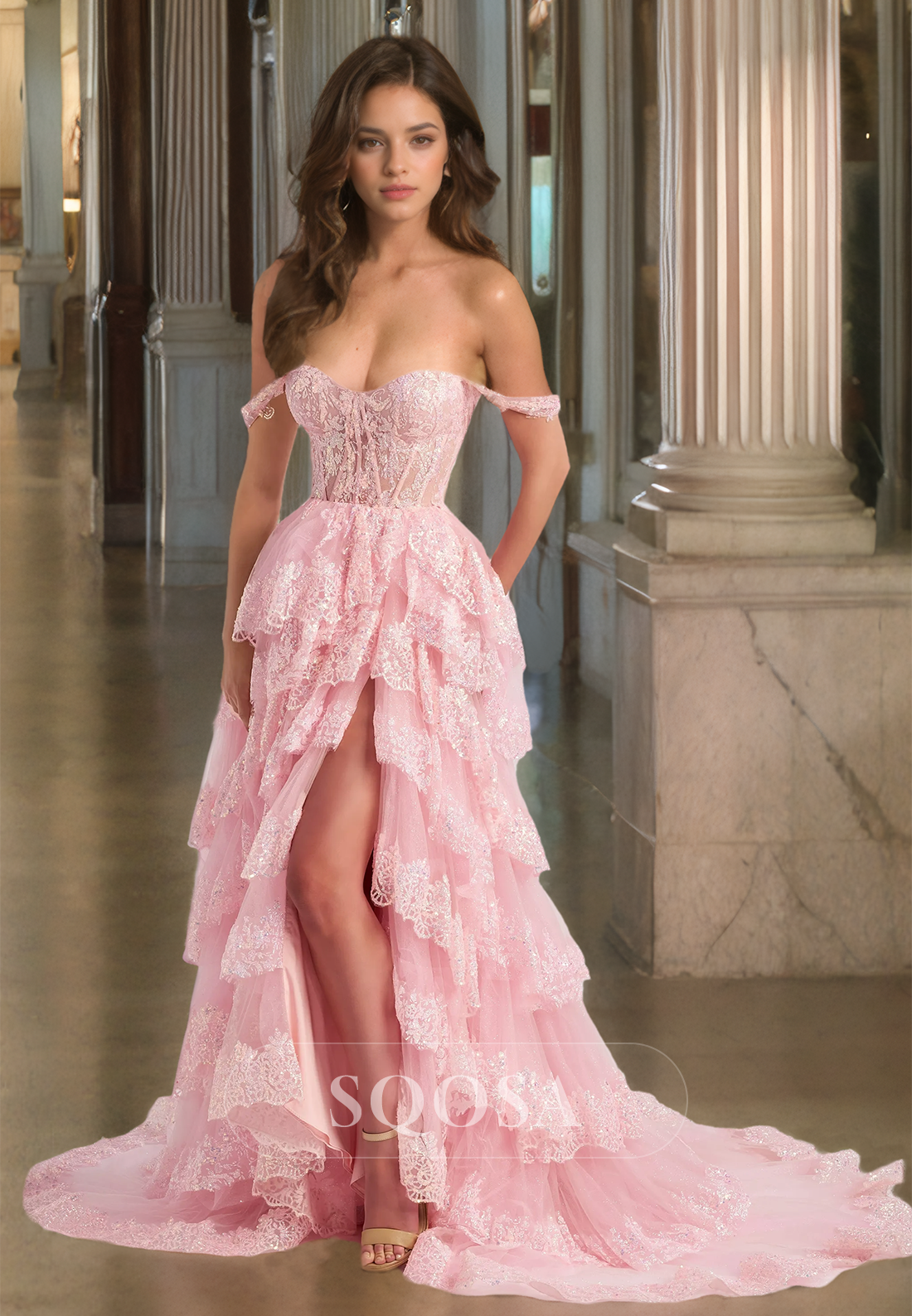 Sweetheart Sleeveless Off-Shoulder Pleaded A-Line Prom Dress Beaded Sequined Applique Slit Party Gowns