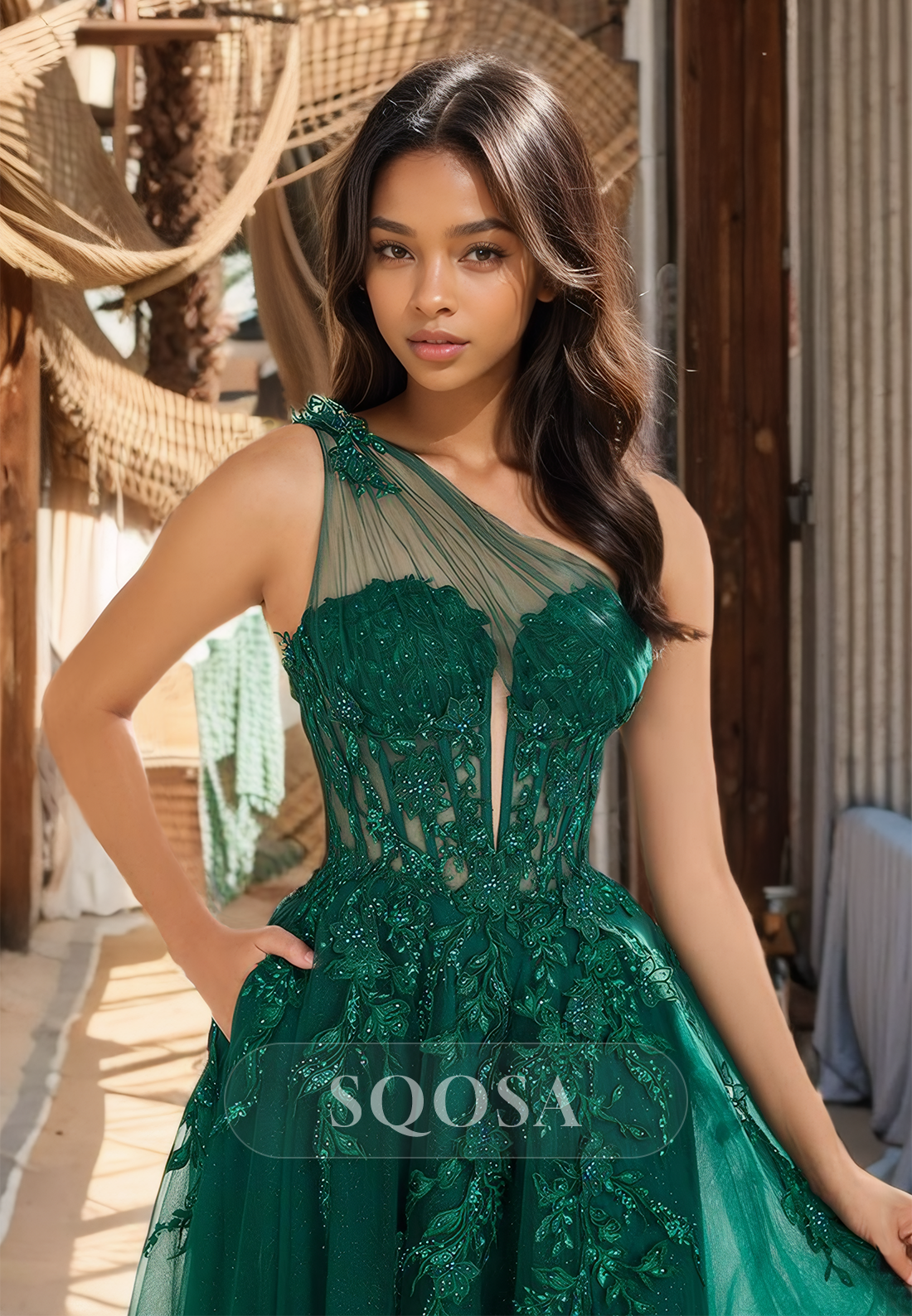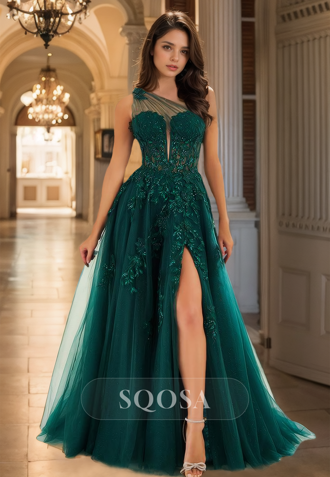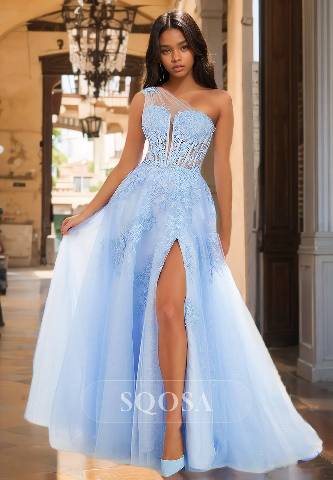 Tulle One-Strap Sweetheart Sleeveless Party Dress Pleated Applique Cutout High Slit Prom Dress