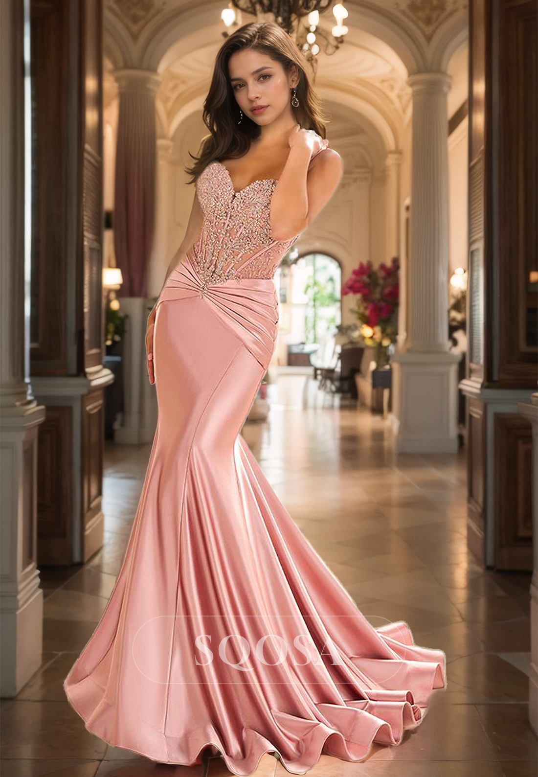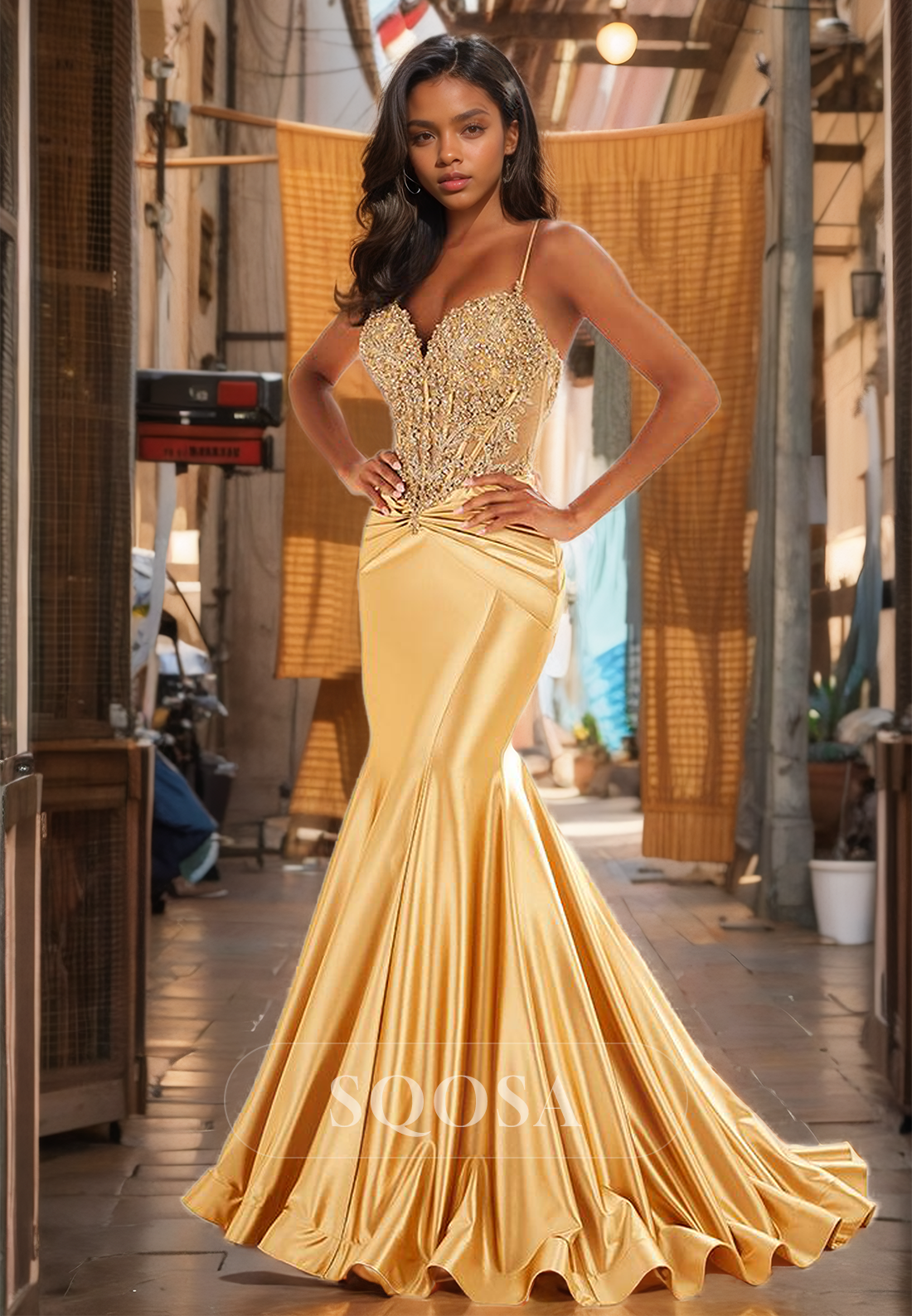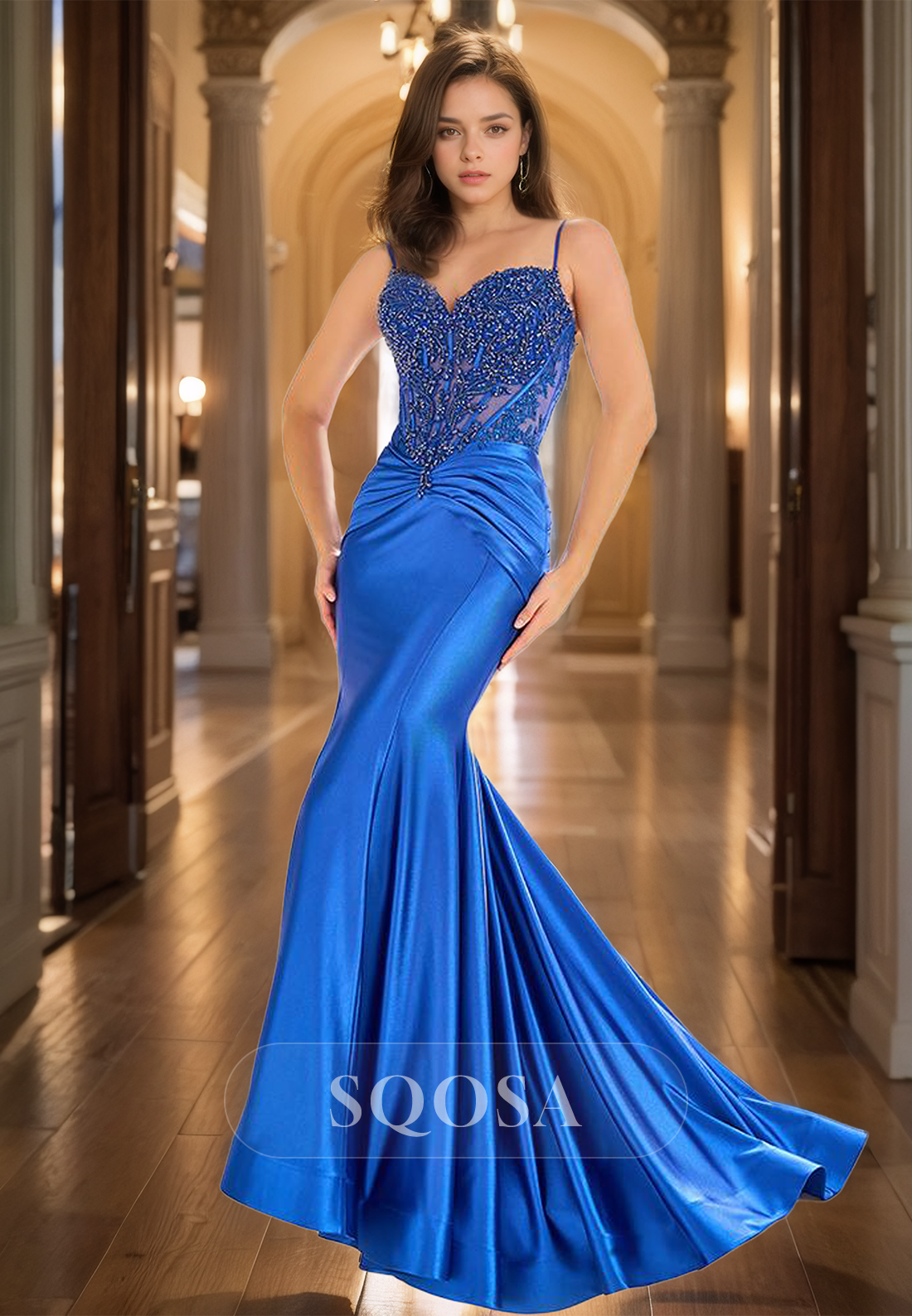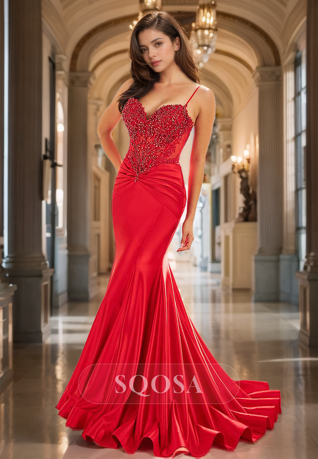 Applique Beaded Pleated Sweep Train Mermaid Prom Dress Sweetheart Spaghetti Straps Formal Gowns