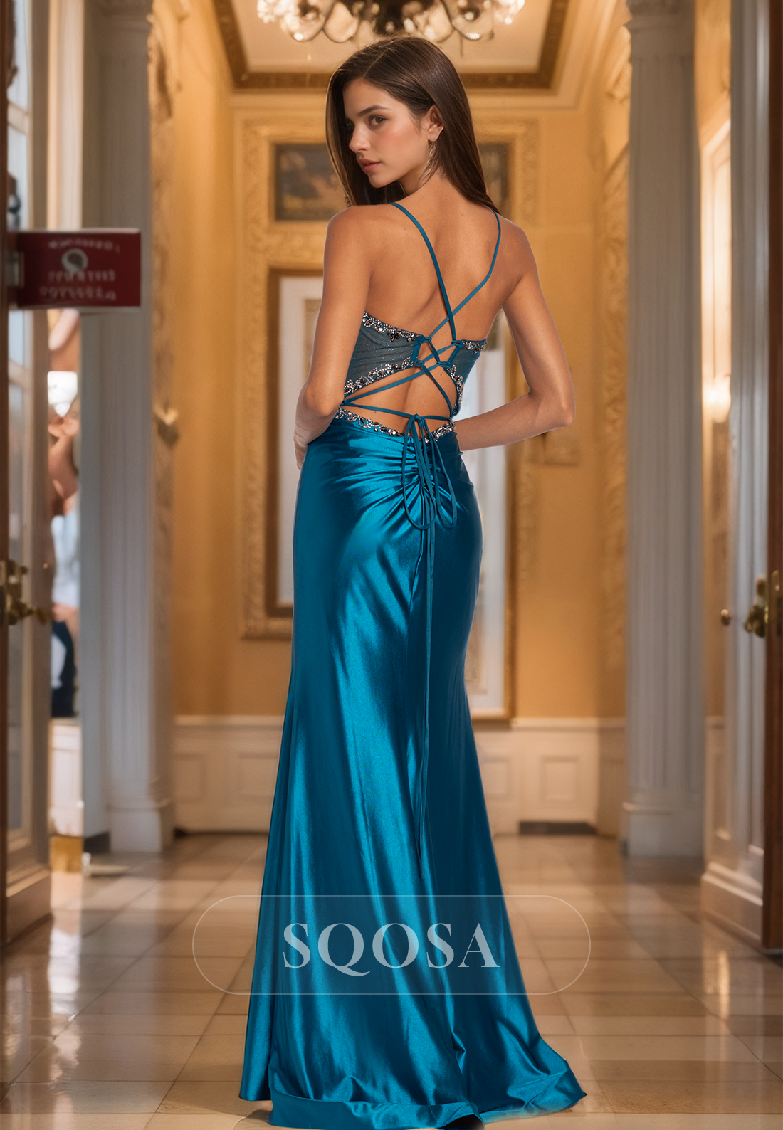 Enhance your prom look with our elegant V-Neck Spaghetti Straps Sleeveless Mermaid Prom Dress. Beaded appliques and pleated detailing add a touch of sophistication to the classic design. Flattering and comfortable, this formal gown will make you feel confident and stunning on your special night.
