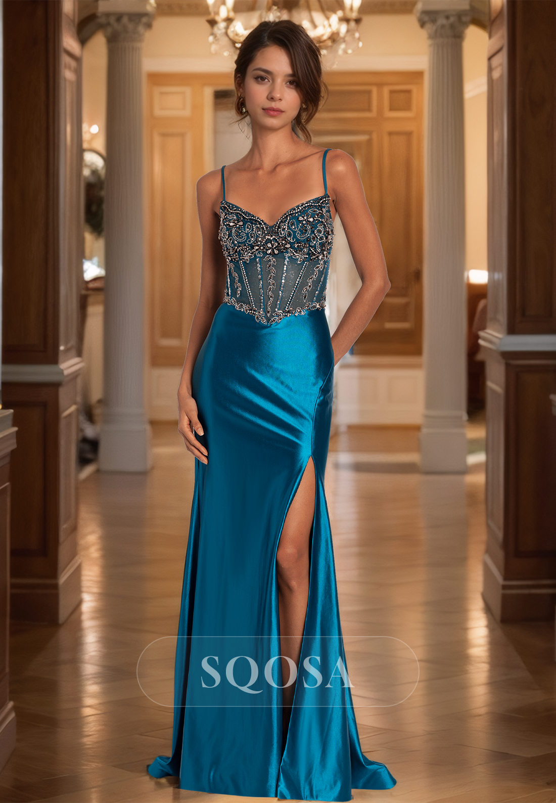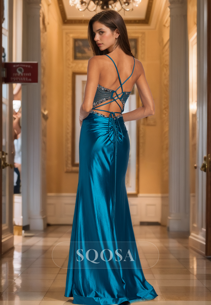 V-Neck Spaghetti Straps Sleeveless Mermaid Prom Dress Beaded Applique Pleated Formal Gowns