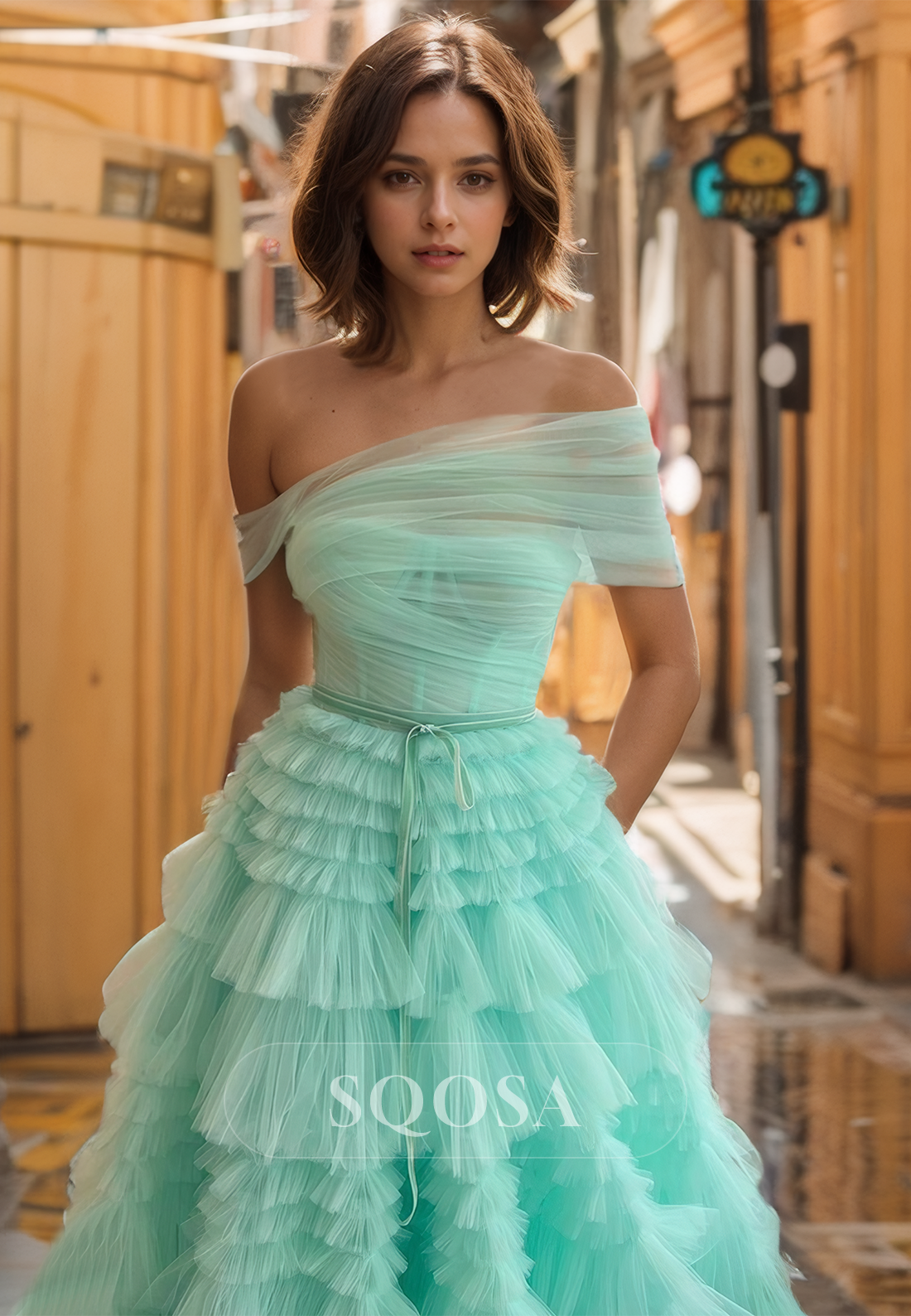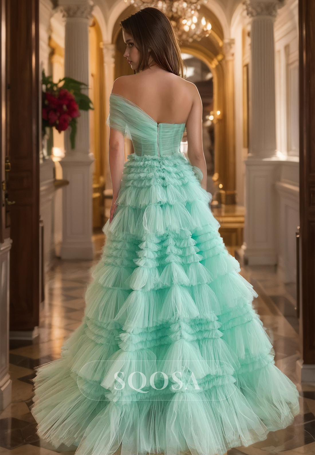 Asymmetrical-Neck Sleeveless Long Formal Gowns Sleeveless Pleated Tiered Tulle A-Line Prom Dress