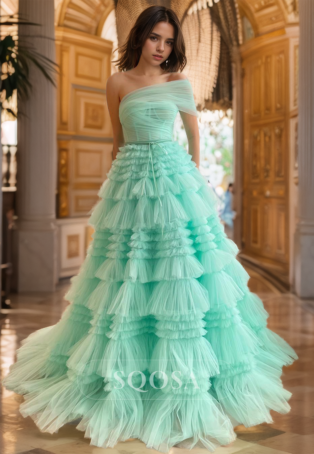 Asymmetrical-Neck Sleeveless Long Formal Gowns Sleeveless Pleated Tiered Tulle A-Line Prom Dress x 1;