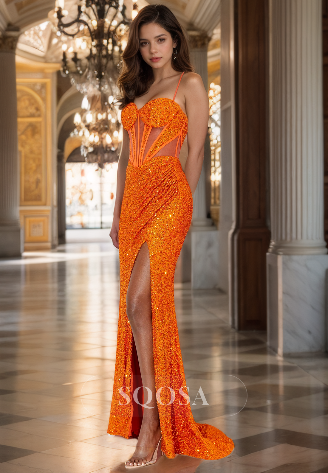 Spaghetti Straps Sweetheart High Slit Mermaid Prom Dress Fully Sequined Pleated Formal Gowns