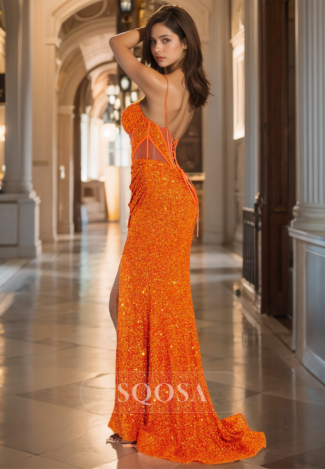 Spaghetti Straps Sweetheart High Slit Mermaid Prom Dress Fully Sequined Pleated Formal Gowns x 1;