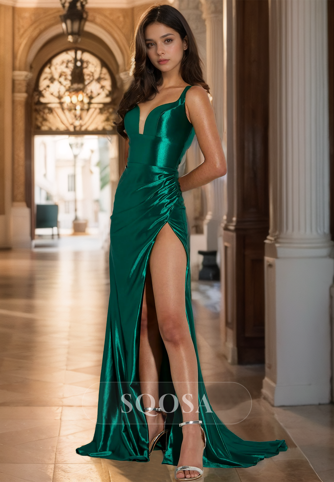Straps Sweetheart Off-Shoulder Mermaid Prom Dress Sleeveless Pleated Satin High Slit Party Gowns x 1;