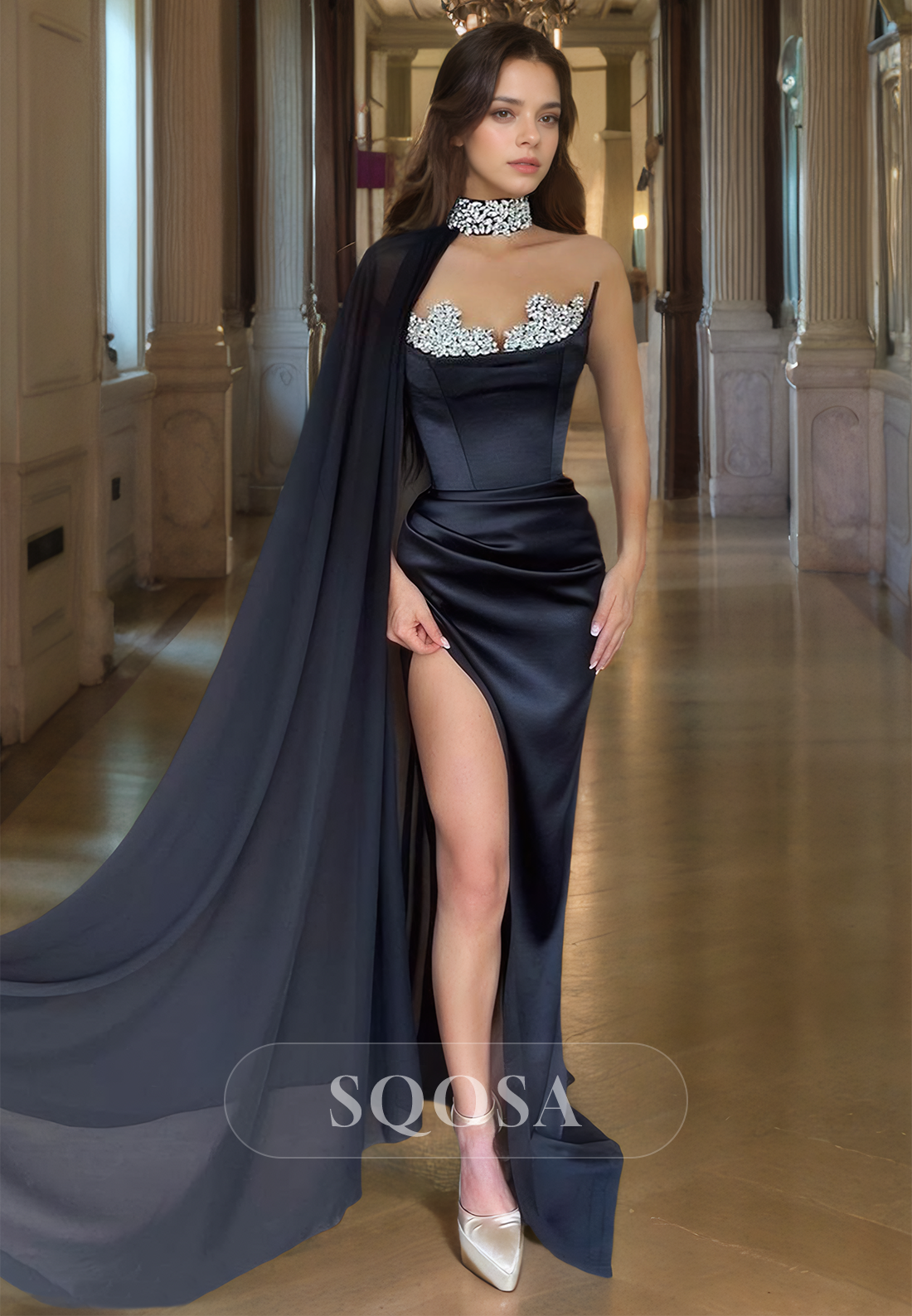 Beaded Halter Sweetheart Sleeveless Mermaid Prom Dress Pleated Floor-Length Party Gowns with Overlay x 1;