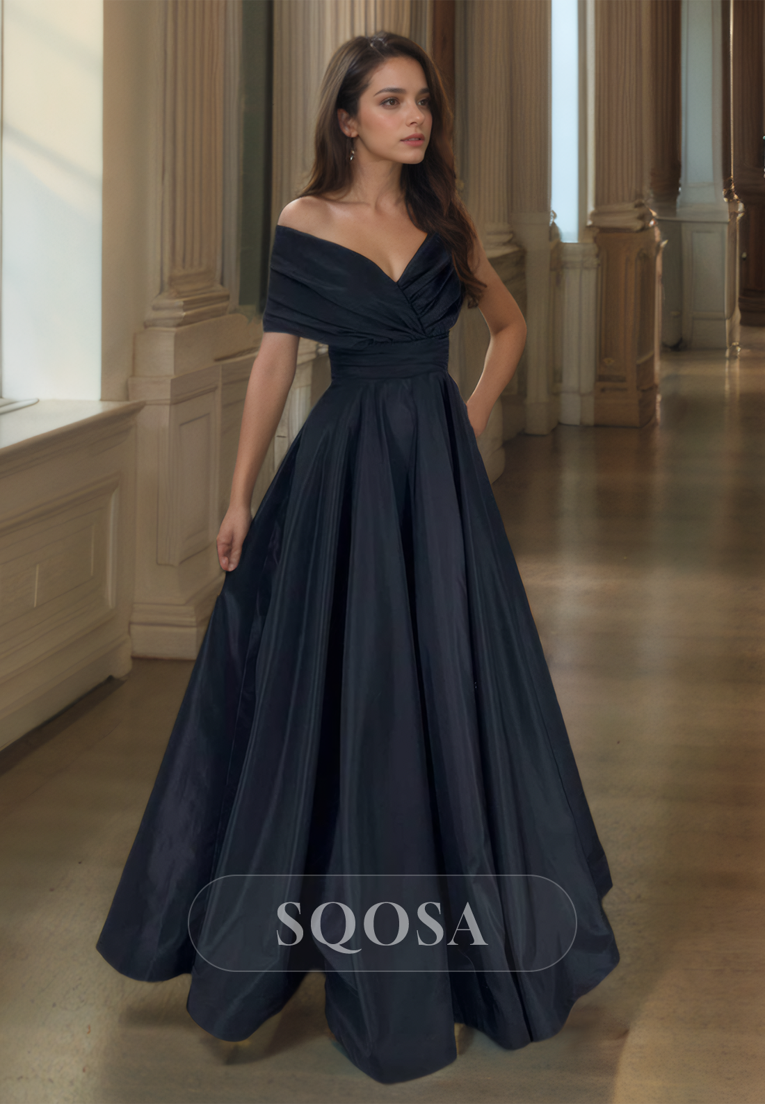 Simple V-Neck Sleeveless A-Line Prom Dress Pleated Floor-Length Satin Formal Gowns