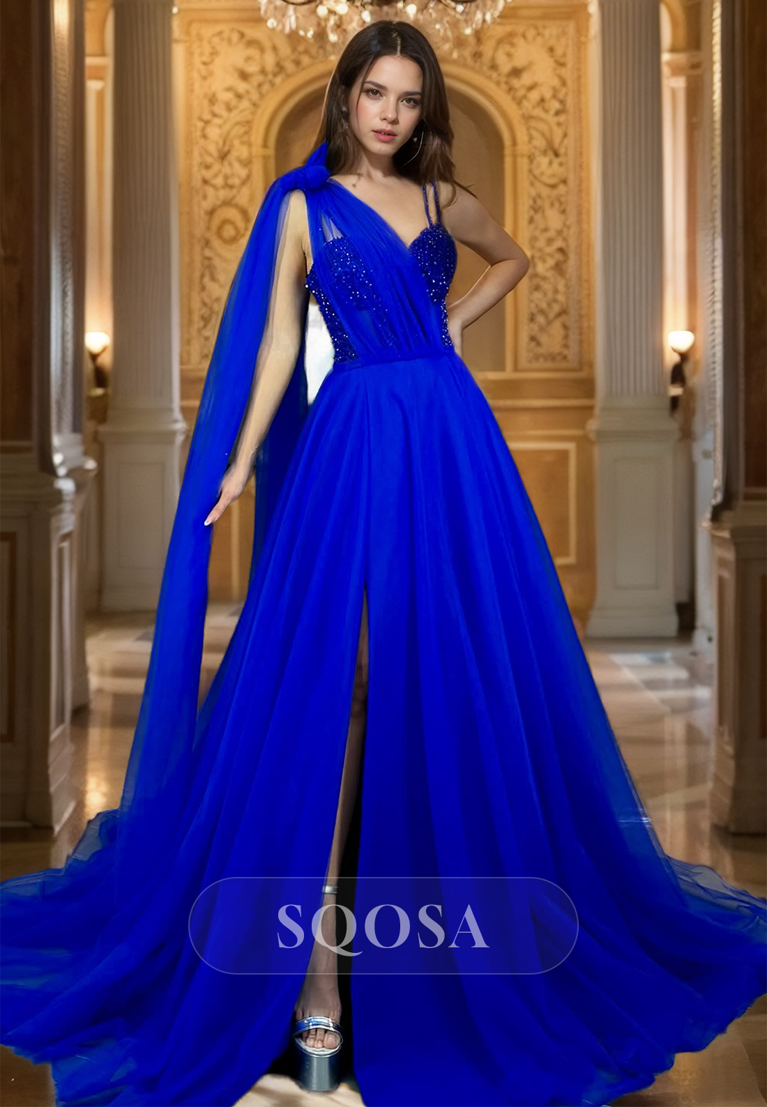 Spaghetti Straps Sweetheart Tulle A-Line Prom Dress Beaded High Slit Evening Gowns with Train x 1;